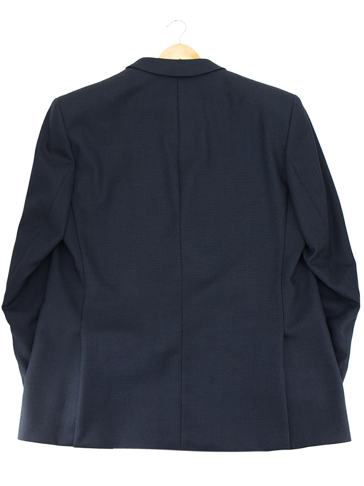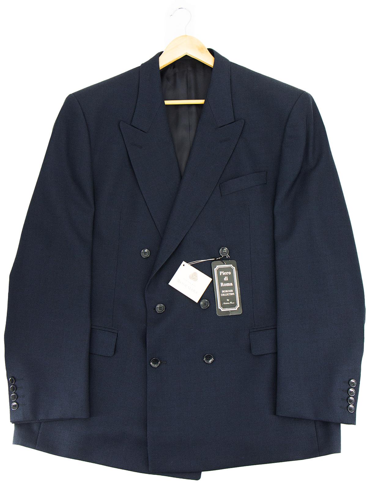 This is a high quality, Italian, pure new wool, demob style suit. Woven in tones of navy blue and black to create an overall navy blue look, with the classic wide peak lapels, a double-breasted six button front and two flap pockets. Fully lined in a beautiful complimentary navy blue with interior pockets and four button cuffs