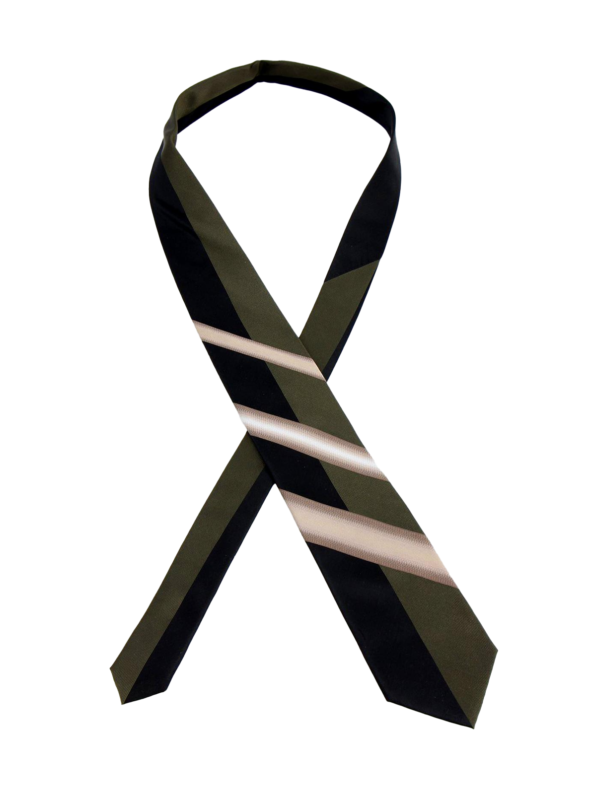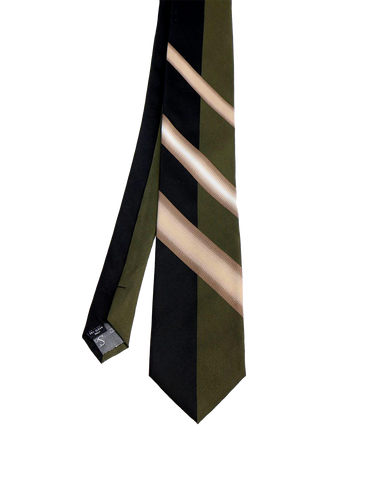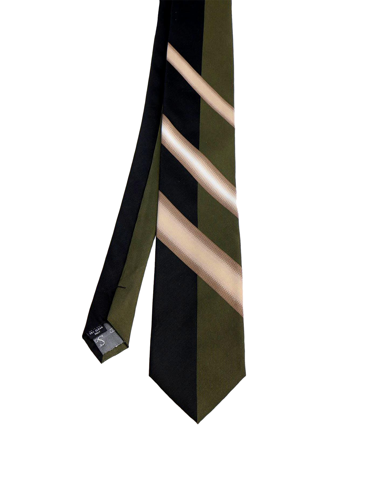 A high quality handmade 1940s style swing tie featuring a striking olive green, black, and cream striped weave. Perfect for adding a touch of vintage sophistication to your ensemble. Made from 100% silk with a classic wide blade for an authentic forties look.