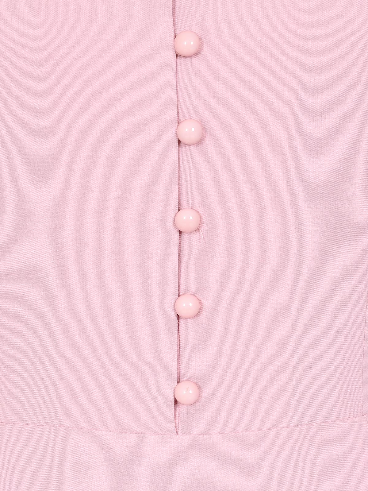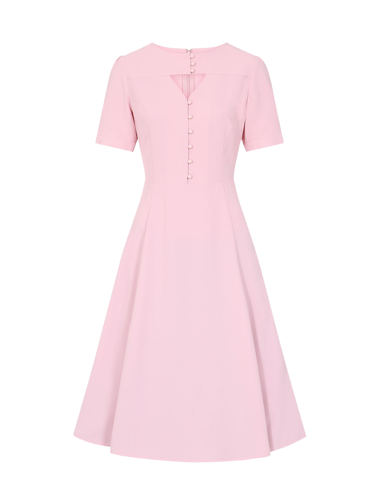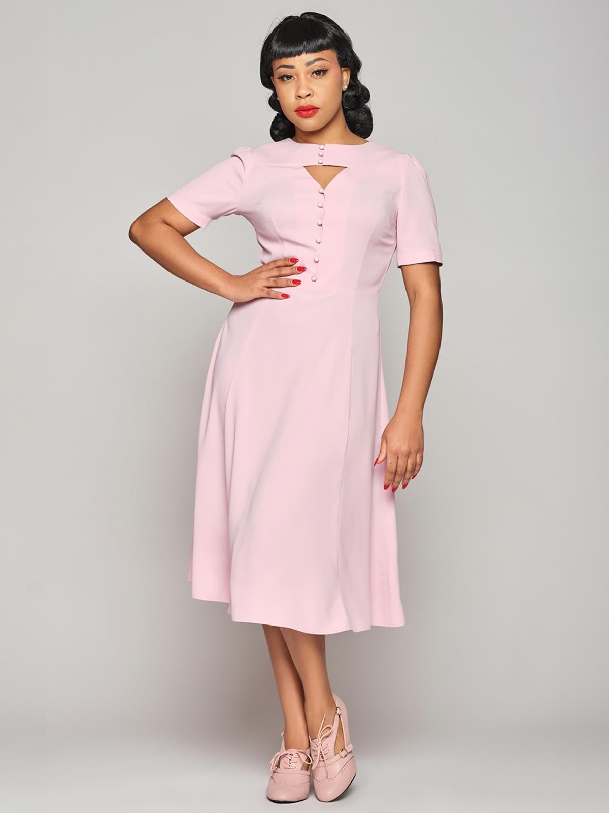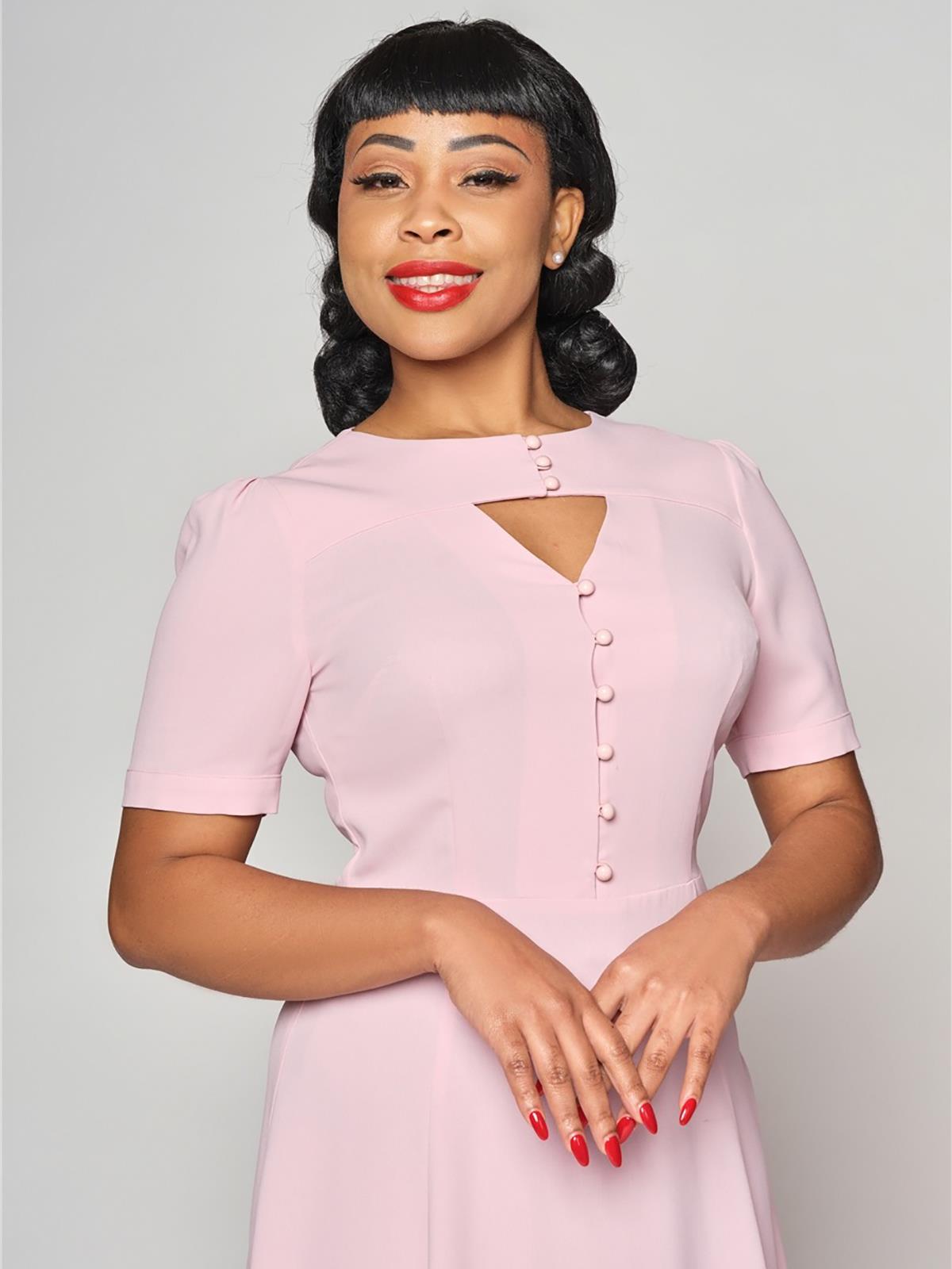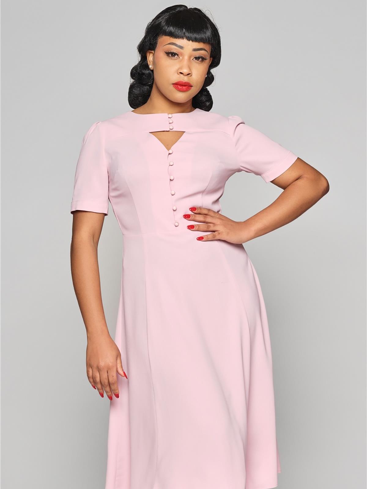 Delicate pink vintage style dress. It features a "V" shape keyhole cut out and a buttoned bodice to create a romantic feel. The sleeves have pleats on the shoulders adding to the retro feel.