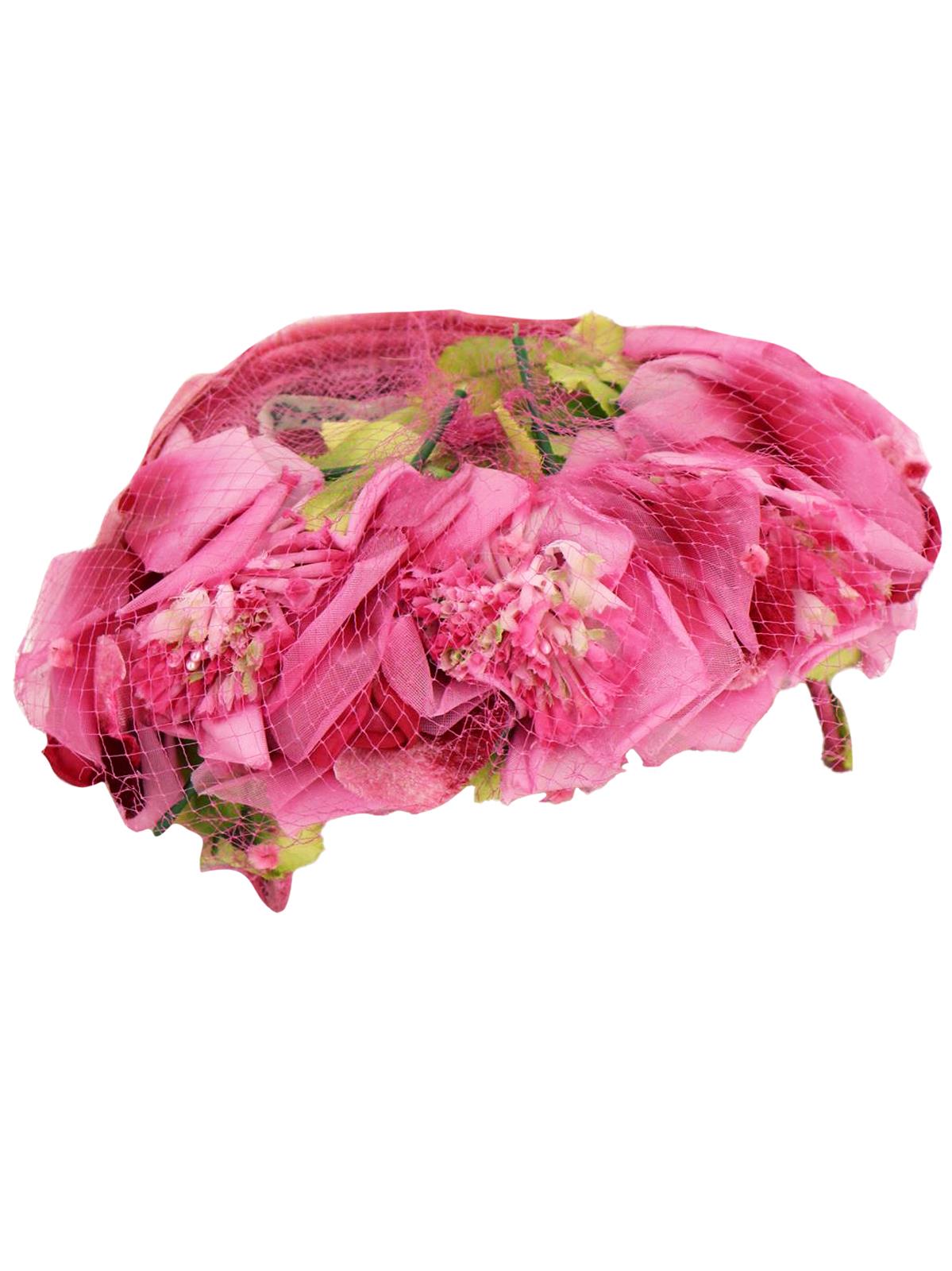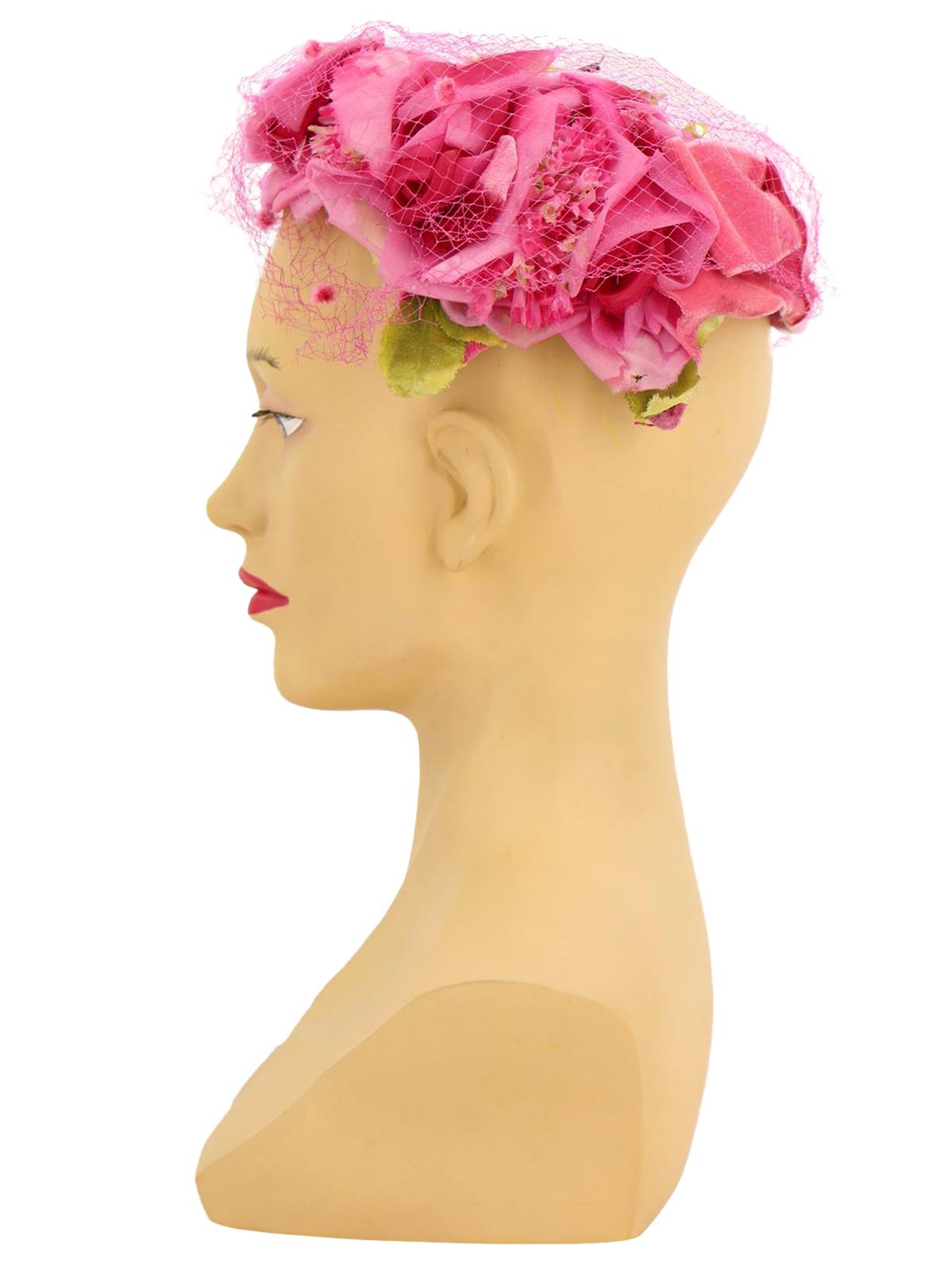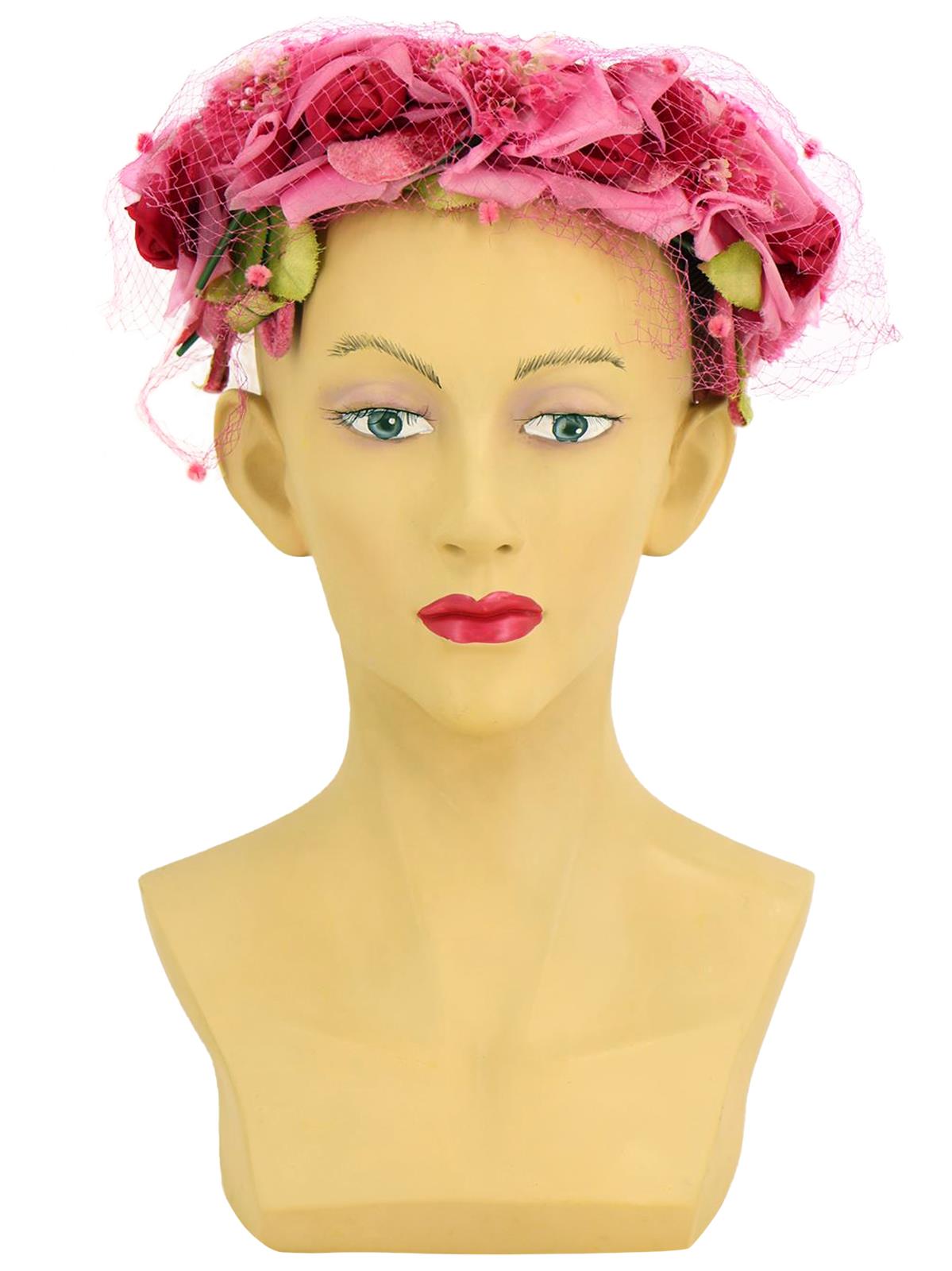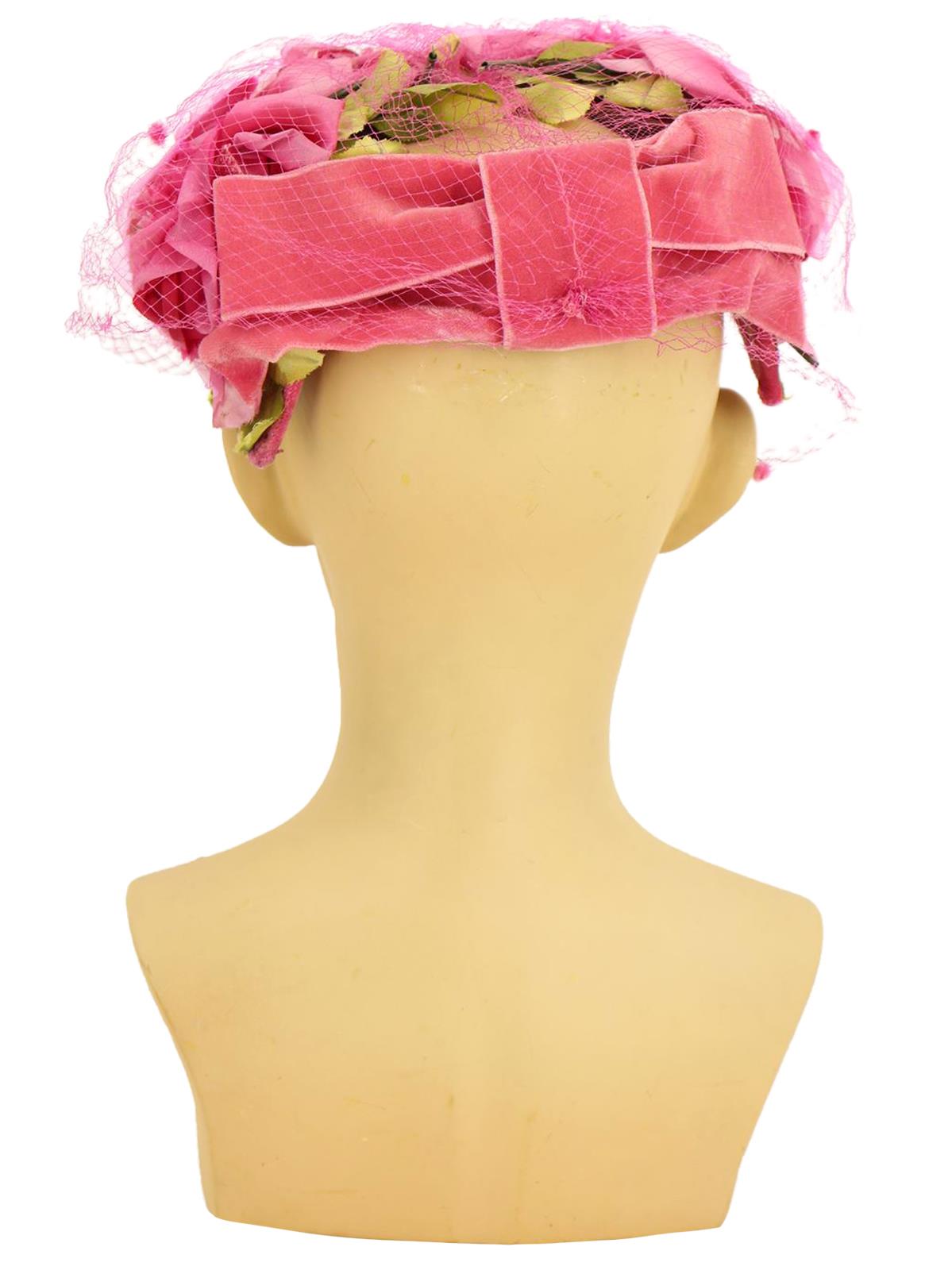 This beautiful pink floral circlet hat would be a showstopping element in any vintage outfit. The vibrant pink faux flowers are accented with green leaves, pink netting, and a large pink velvet bow at the back of the hat.