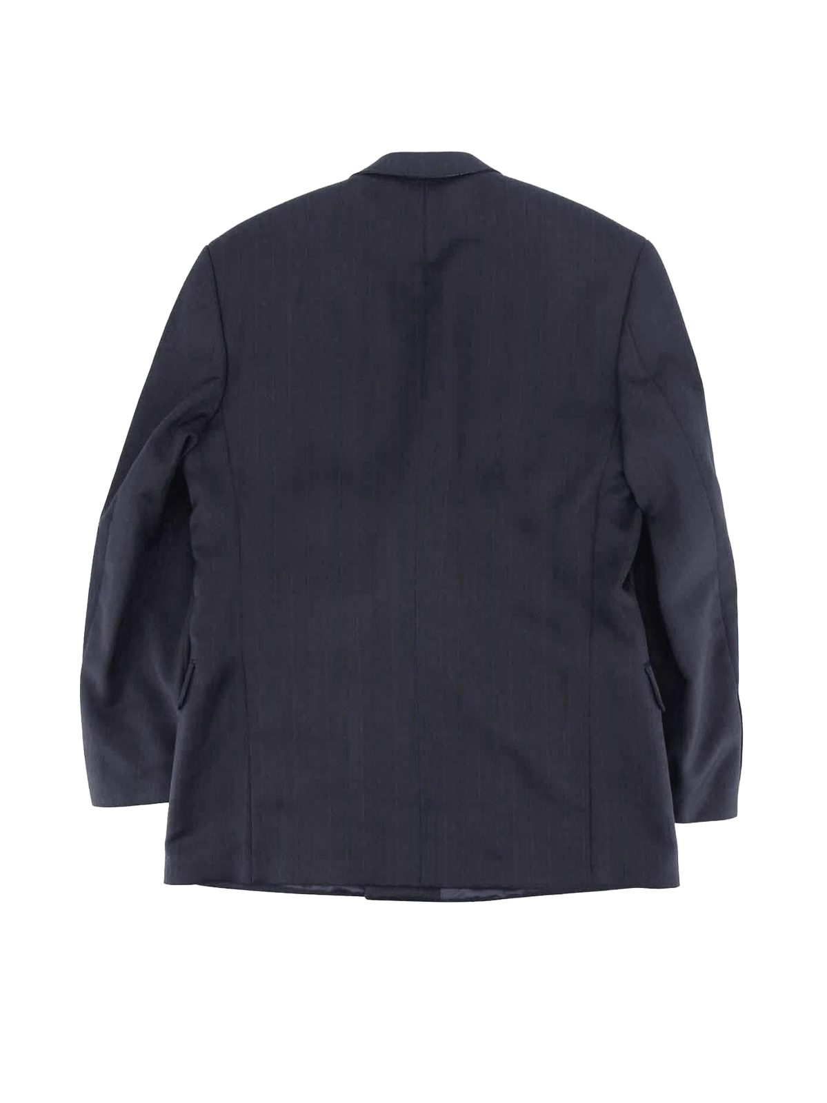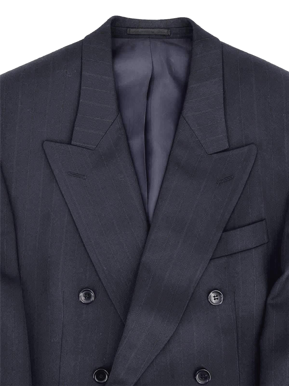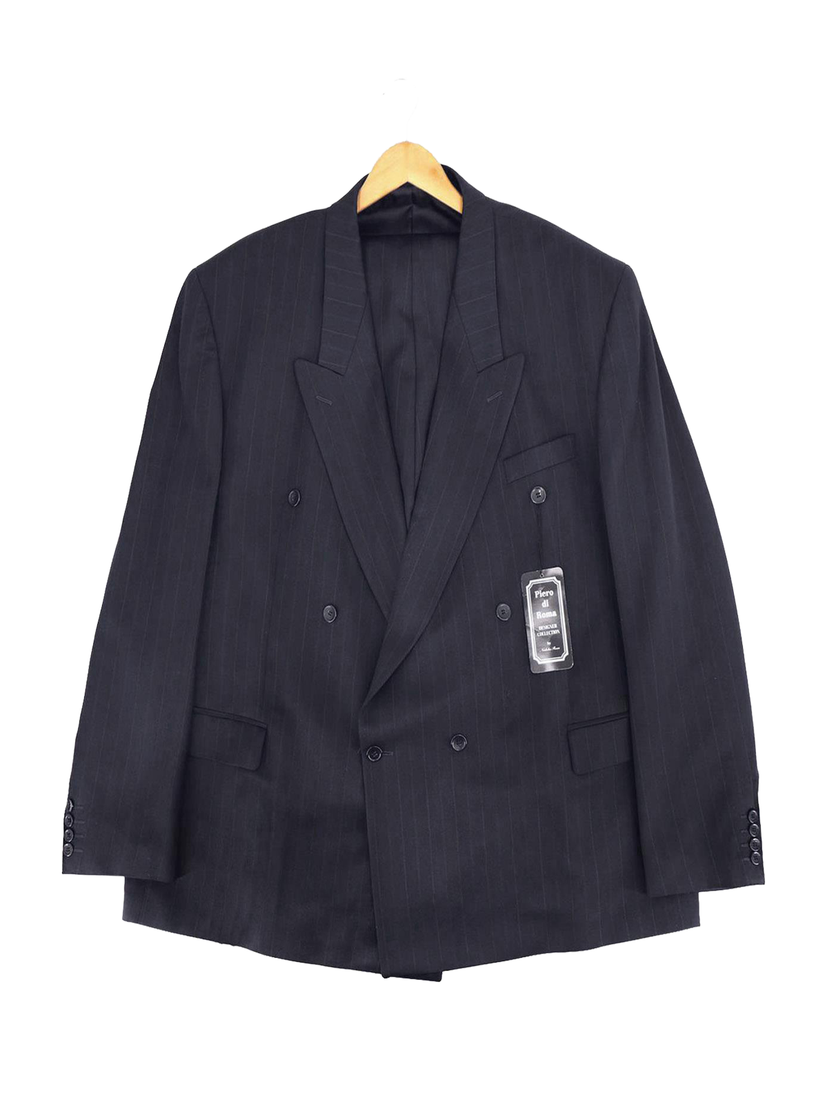This deadstock early nineties tailored suit has a vintage look because of its broad peak lapels and double-breasted cut.