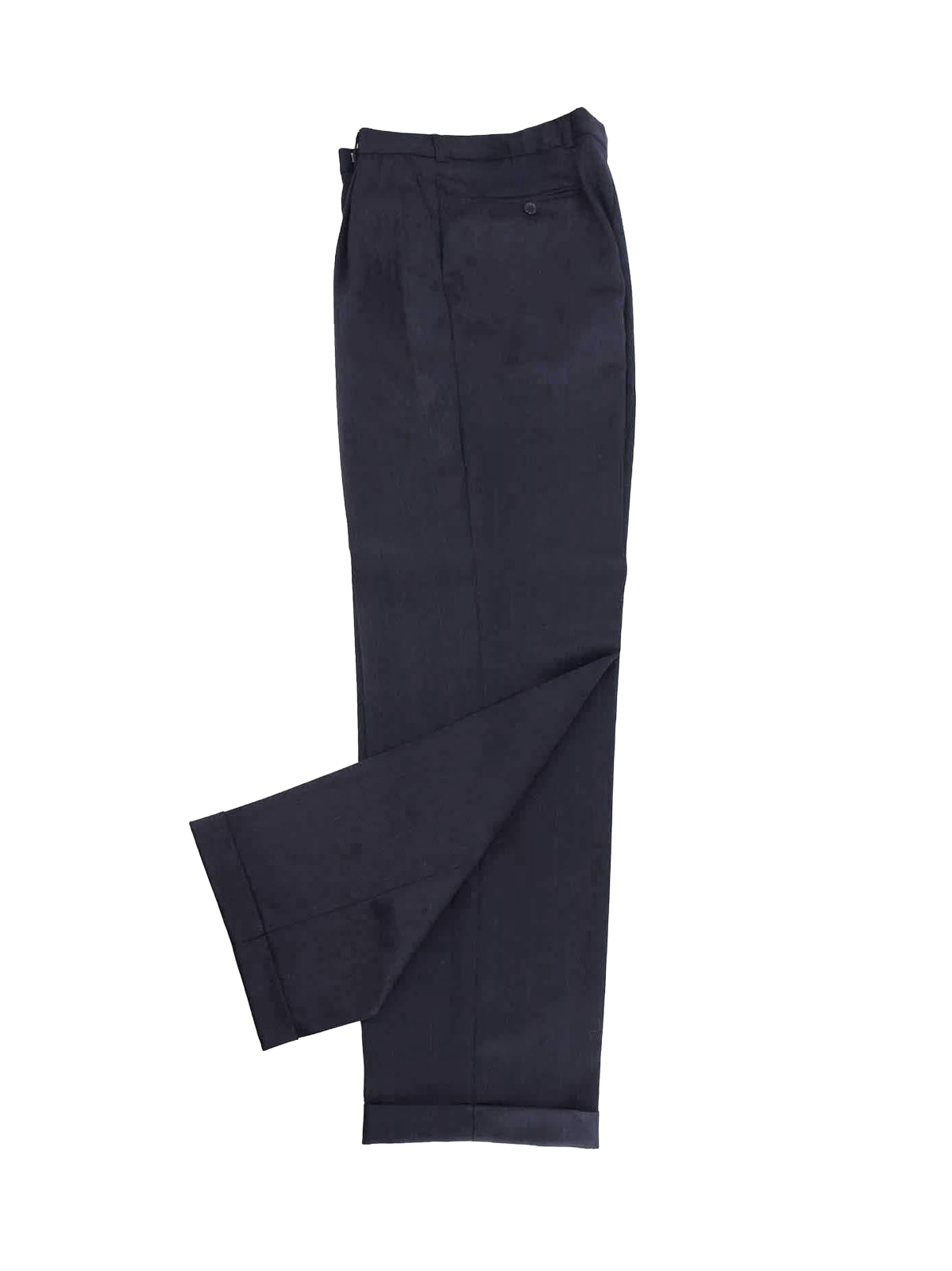 The matching three-pocket trousers have double pleated fronts and turn-up hem cuffs.