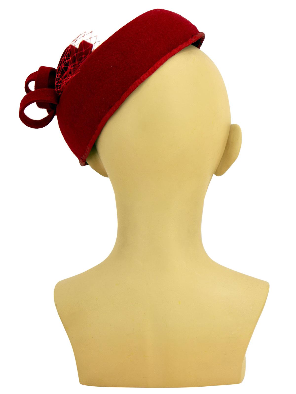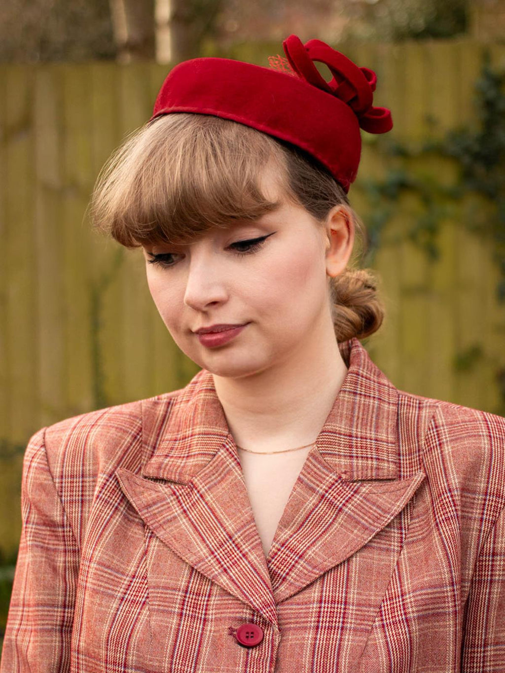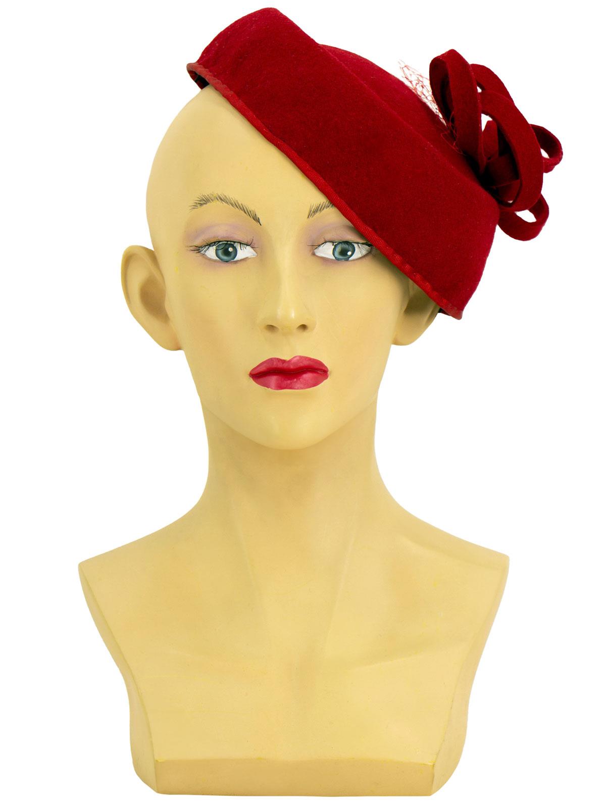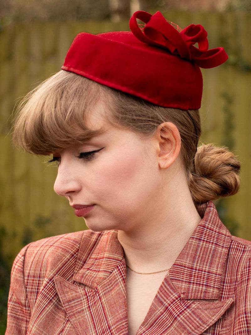 No midcentury vintage wardrobe would be complete without a classic 1940s felt pillbox or coque hat. This hat is an eye-catching red colour, with a felt twist and French veil decorating the top. The pillbox sits to one side on the head for an iconic and formal forties look. An authentic and timeless hat that will enhance your look at formal events, outings and vintage festivals.