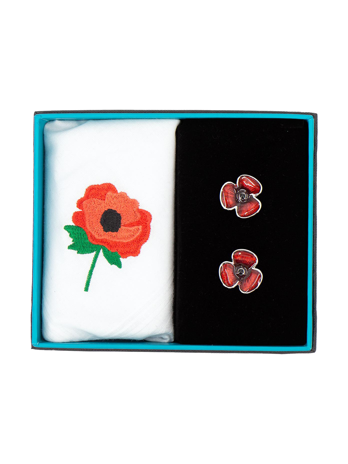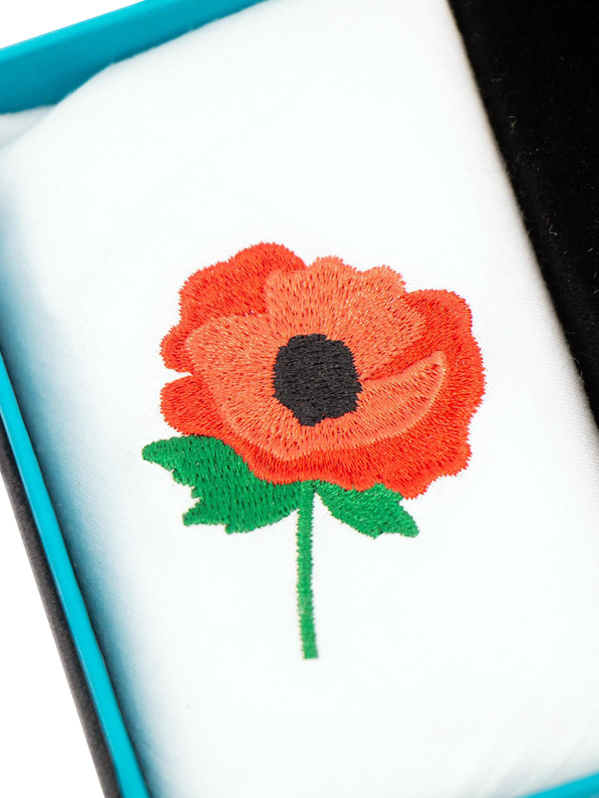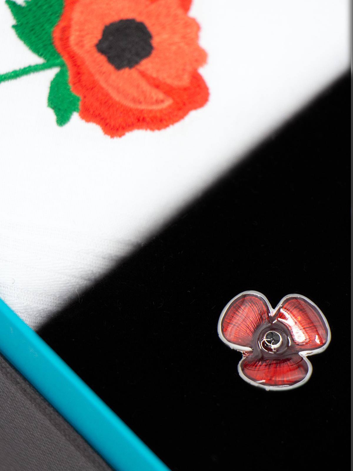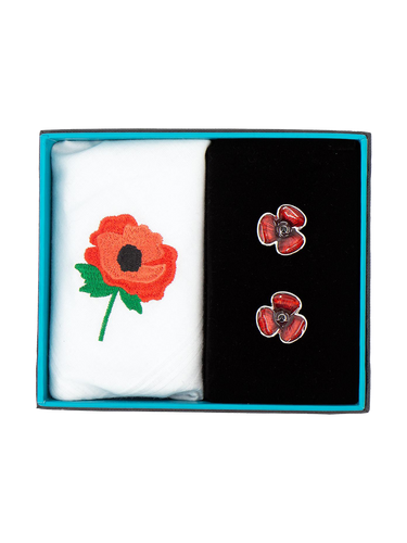 A refined gentleman’s set combining a quality white cotton David Aster pocket square embroidered with a remembrance poppy, paired with matching silver enamel poppy cufflinks. Presented in a smart gift box.