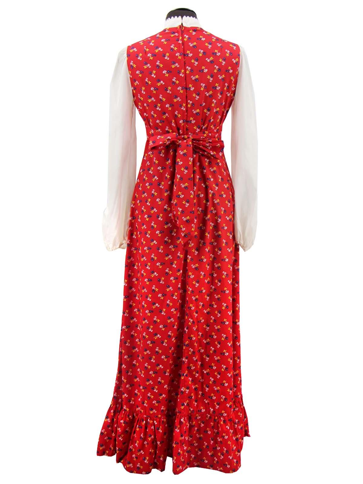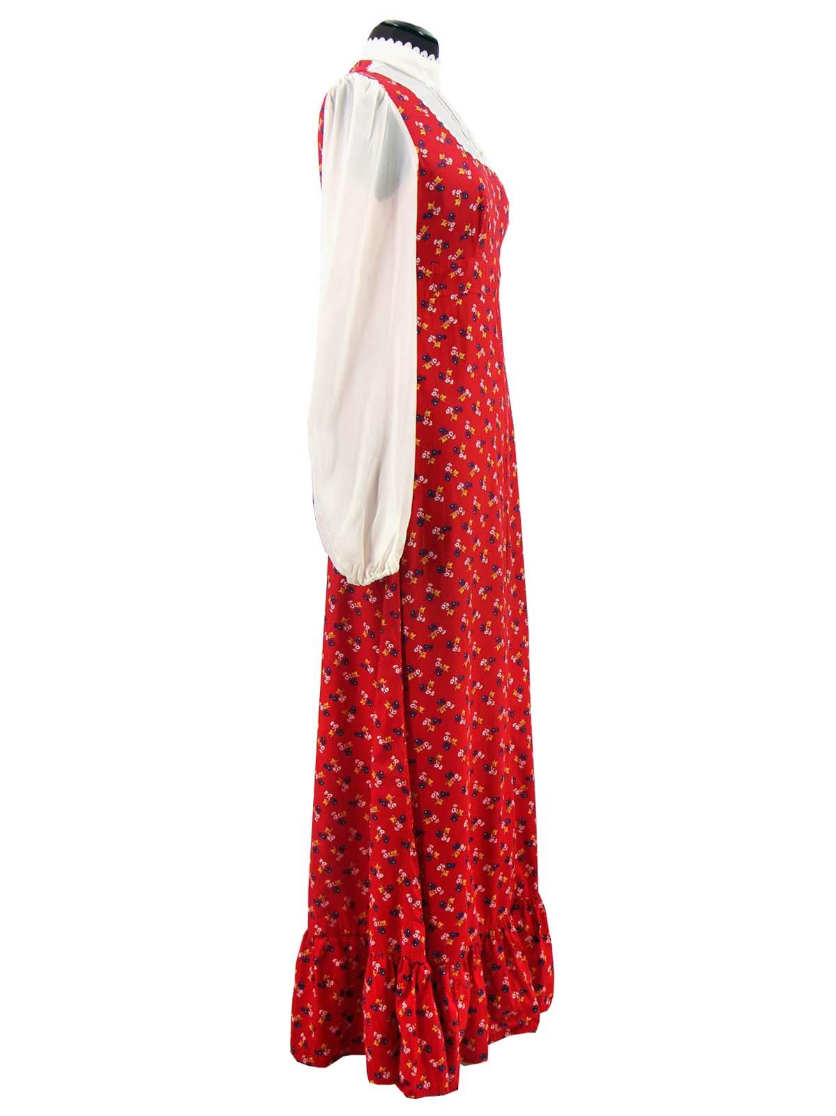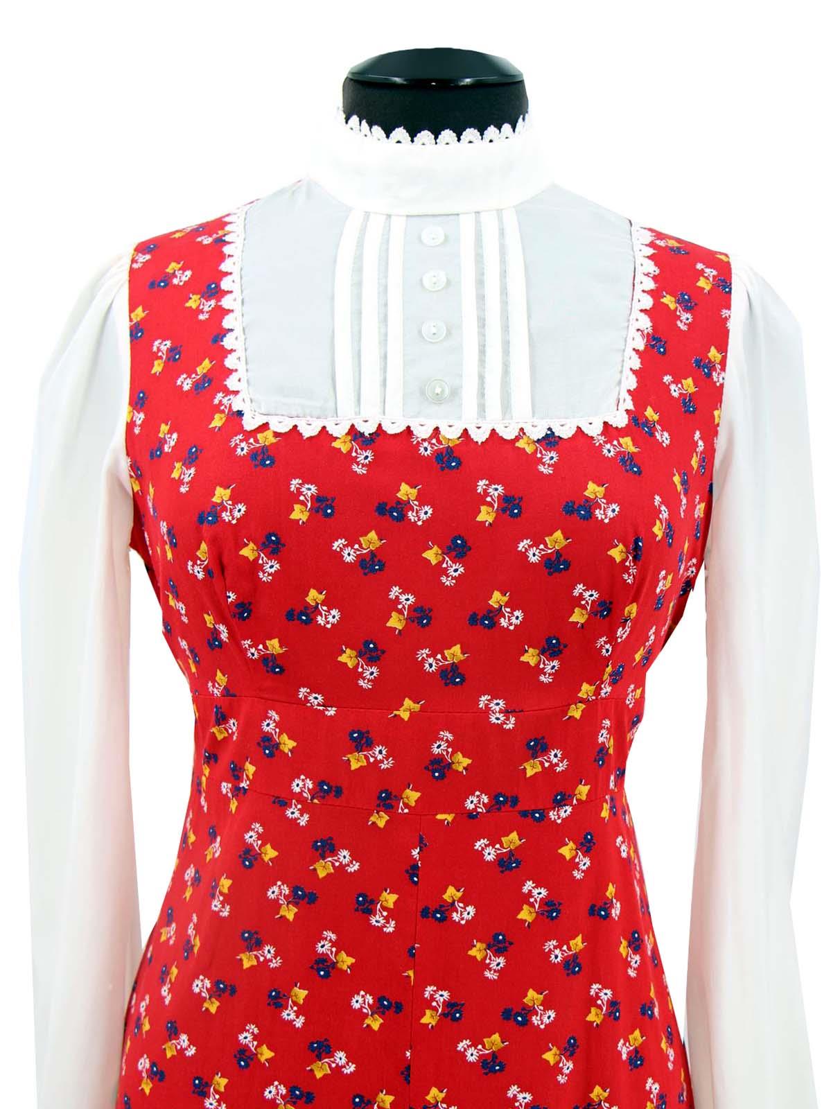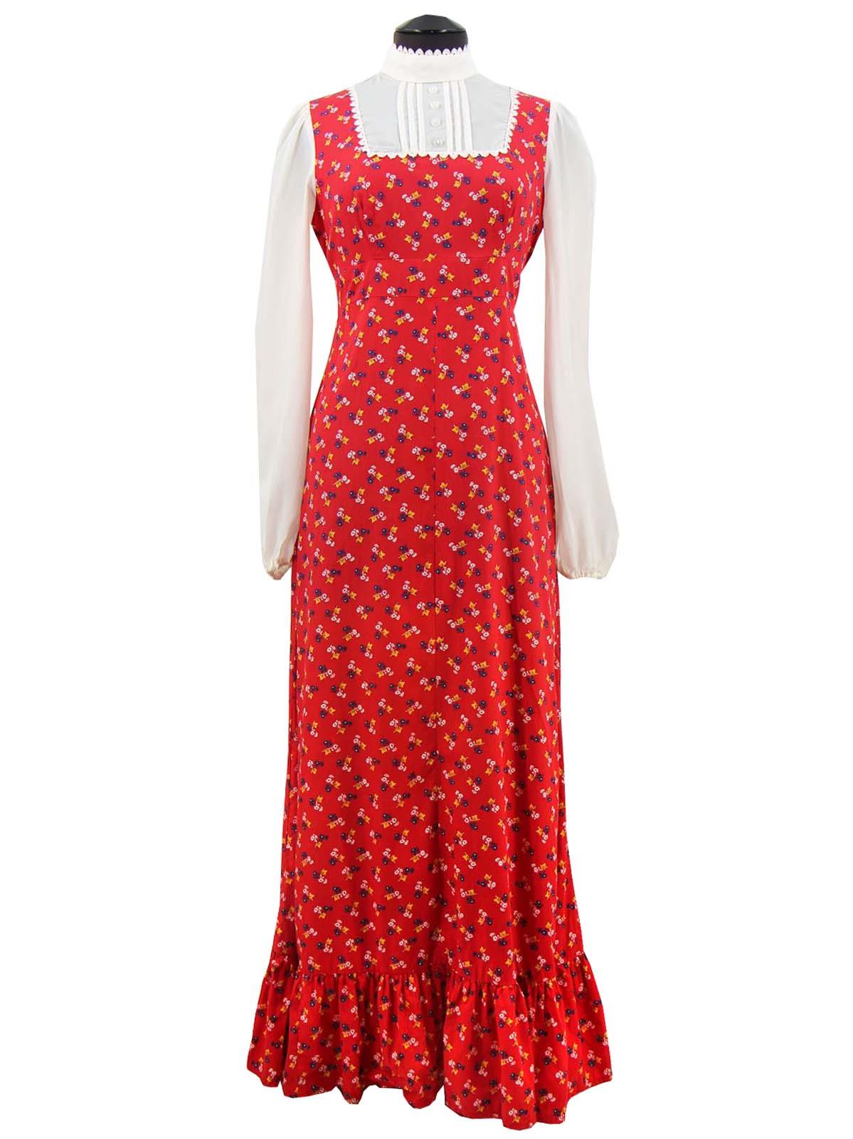 Iconically seventies vintage longline maxi dress, with a layered illusion on the bodice. A square yoke on the chest is detailed with faux buttons and pleating to give the look of a shirt, with long bishop sleeves to complement this. Lace trim decorates the neckline and yoke.
