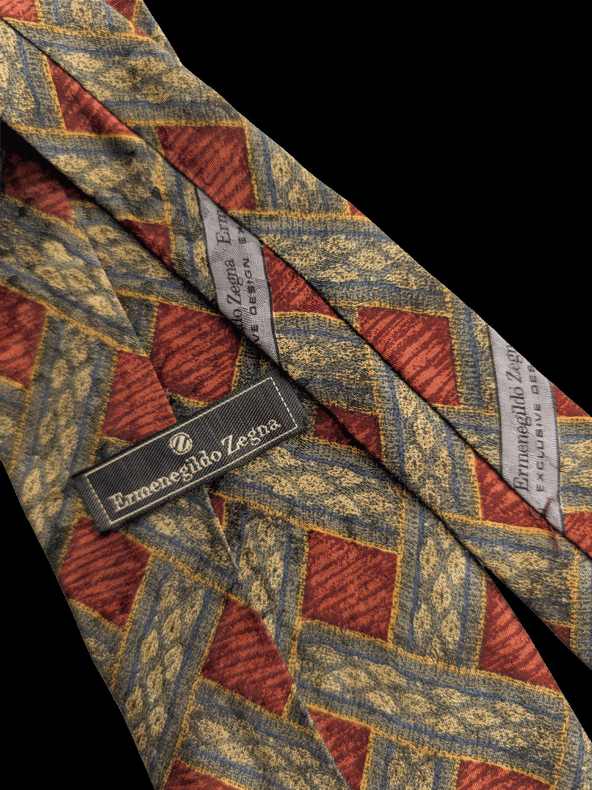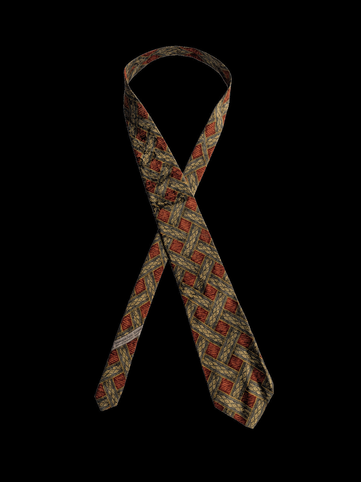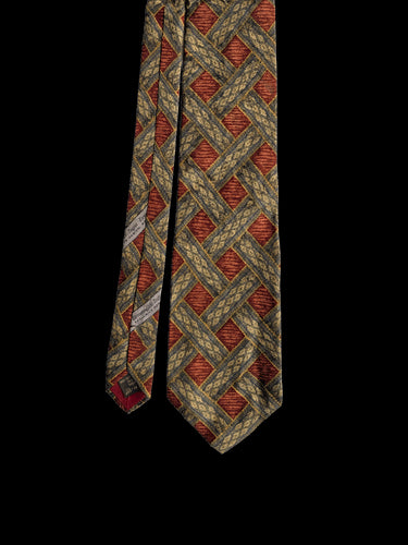 A designer tie with the quality you would expect from Ermenegildo Zegna label. Highest quality silk in a rich finish. Featuring an eye catching repeat geometric pattern resembling an interwoven basketweave in deep rust red, gold, and grey. A classic tie to coordinate with midcentury clothing.