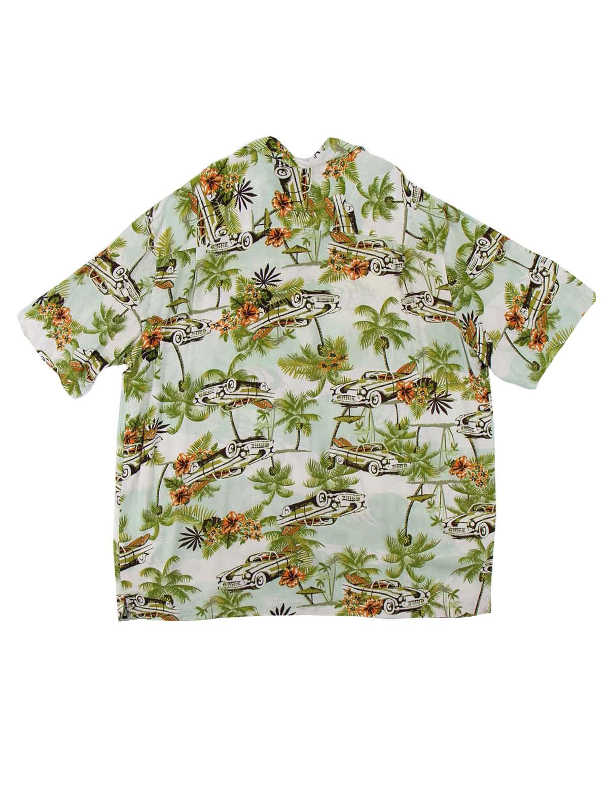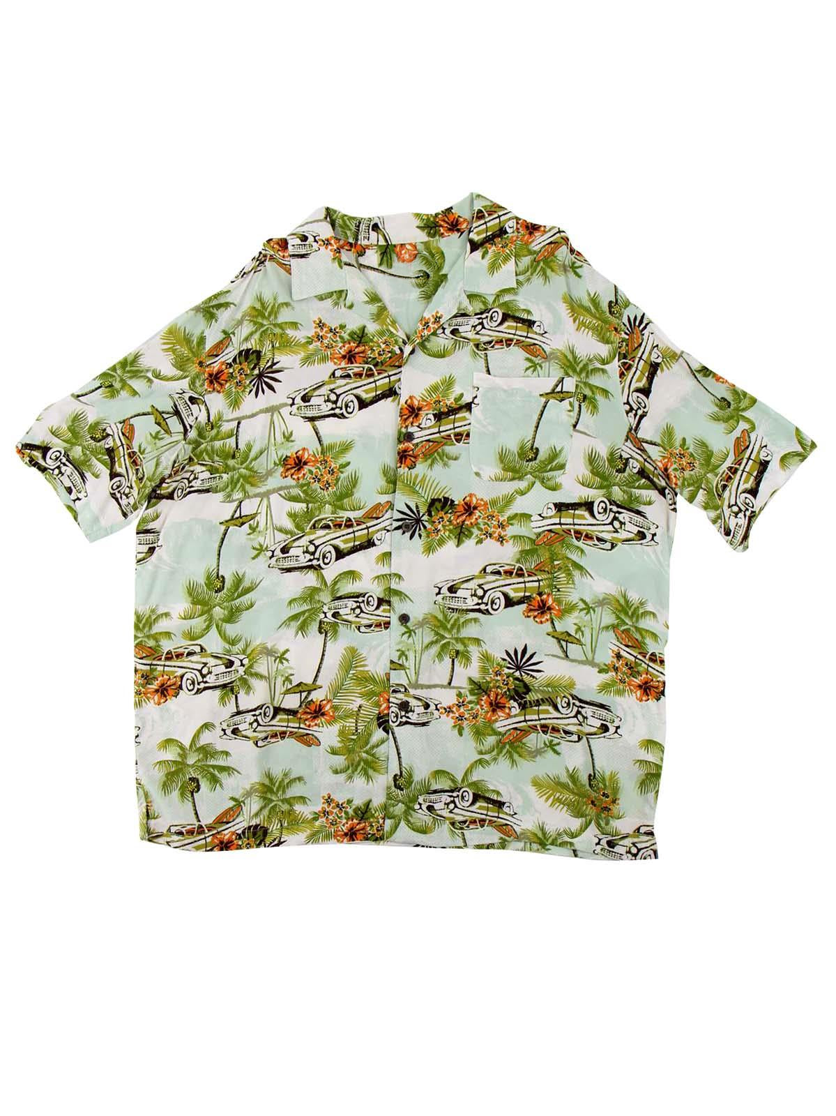 1950s retro cars and palm trees decorate this vintage Hawaiian shirt with a relaxed, open fifties Havana collar.