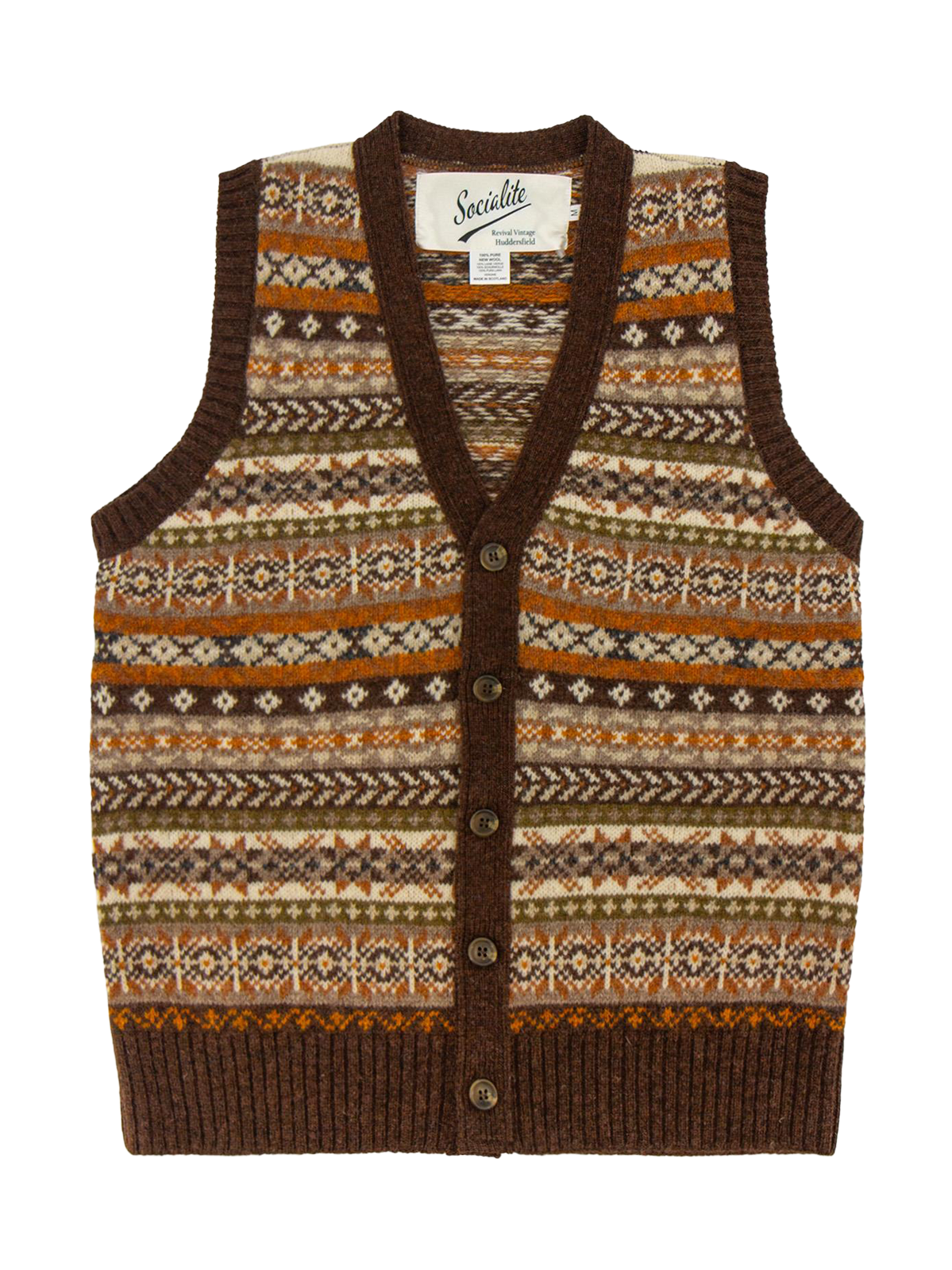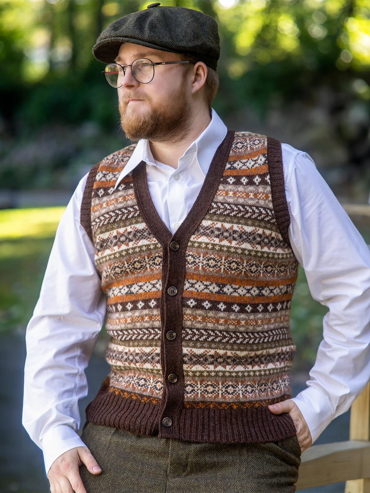 This pure Scottish wool knit vest is a durable, high-quality addition to any vintage wardrobe. Designed by Revival Vintage and made exclusively for our Socialite label by Harley of Scotland, it offers authentic 1940s charm with true heritage craftsmanship. Styled in a sleeveless V-neck design, it comes in a warm brown shade with orange and cream Fair Isle accents.