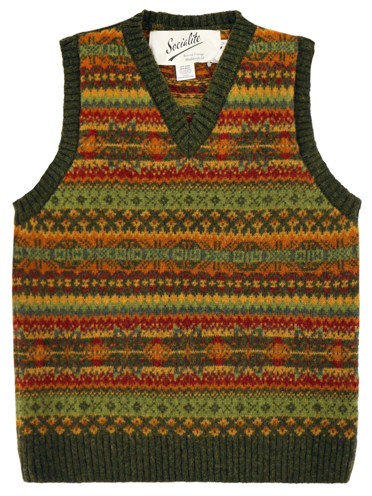 This particular style is a sleeveless V-neck tank top or vest in a warm green shade, with accents of orange and red.