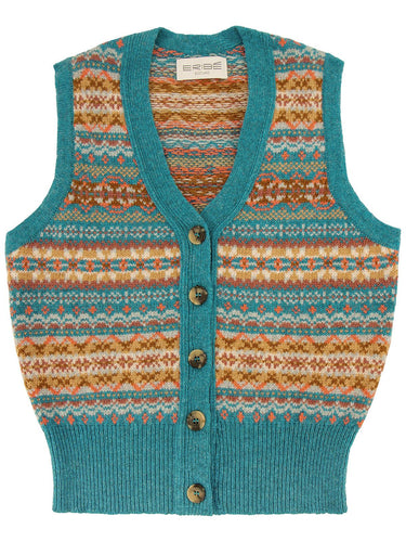 This women's knitted waistcoat has a flattering women's cut that highlights the waist in that classic 1940s way. Crafted from authentic Scottish wool, this piece features a classic Fairisle knit design that complements vintage attire.