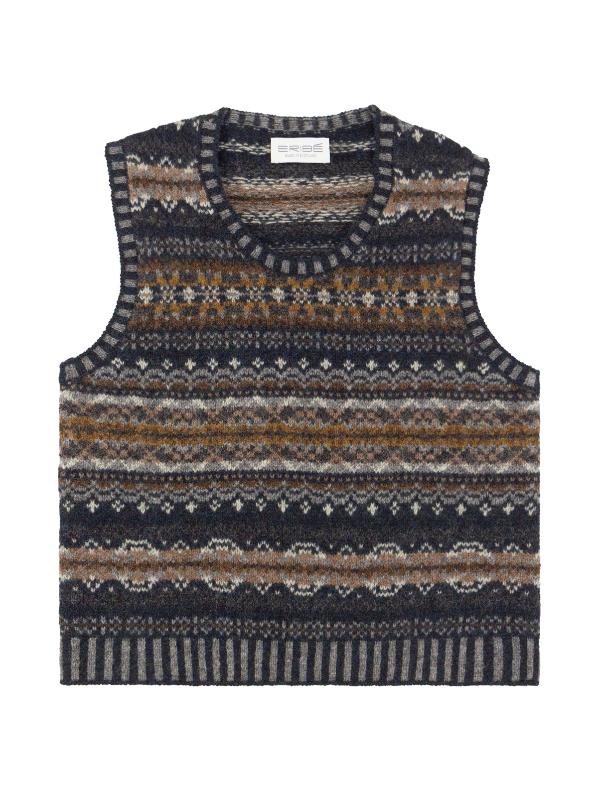 This cosy knitted layering garment has a classic 1940s era style, owing to its Fair Isle knit pattern. Produced in small batches using quality, natural yarns spun that keep you truly warm, by Eribé an established knitwear design house and manufacturer.