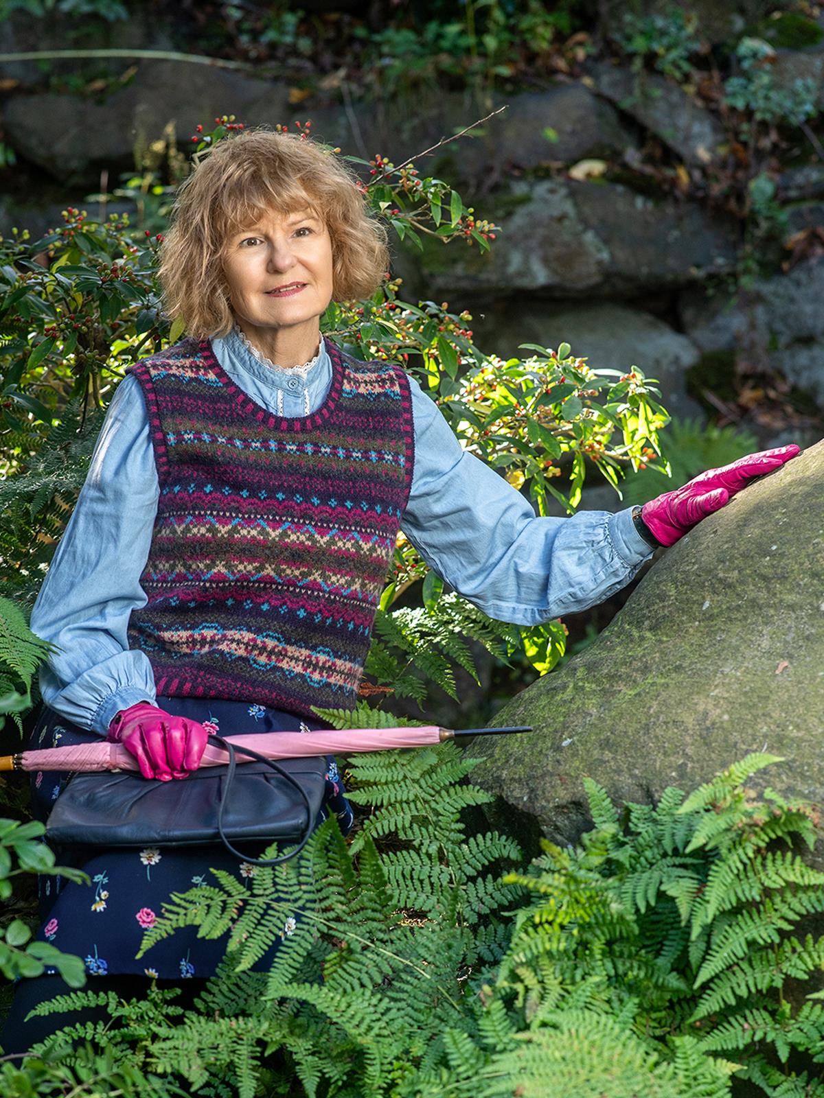 This sleeveless knitted vest, made of pure Scottish wool, features a timeless Fairisle knit pattern that pairs well with 1940s clothing. It has a flattering women's cut that accentuates the waist.