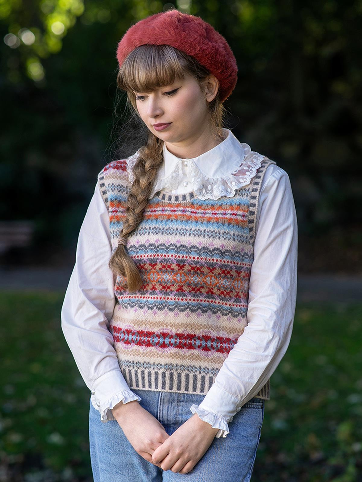 This sleeveless knitted vest, crafted from pure Scottish wool, showcases a classic Fairisle knit design that complements 1940s attire. Designed with a flattering women's cut that highlights the waist.
