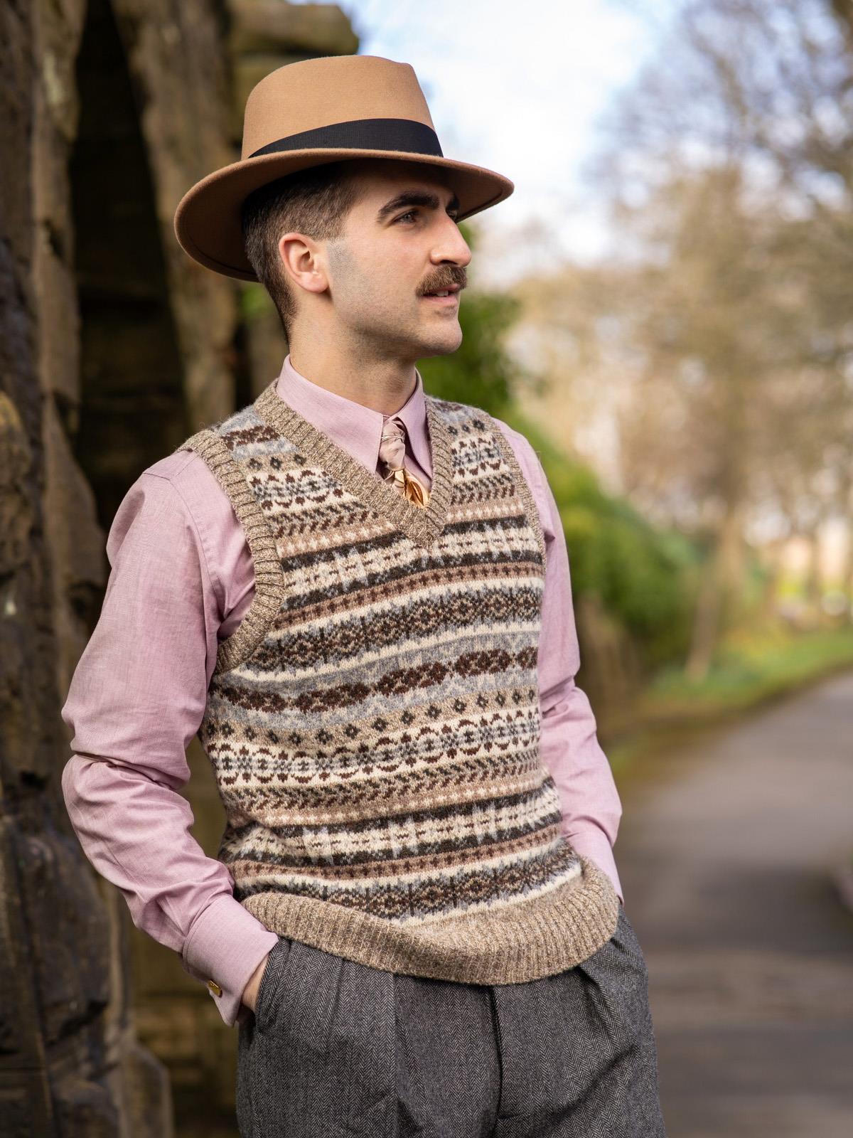 Expertly hand-produced from pure Scottish Shetland wool. High-quality knitwear to give you a classic wartime forties-era look.