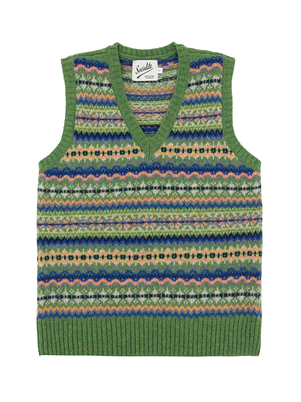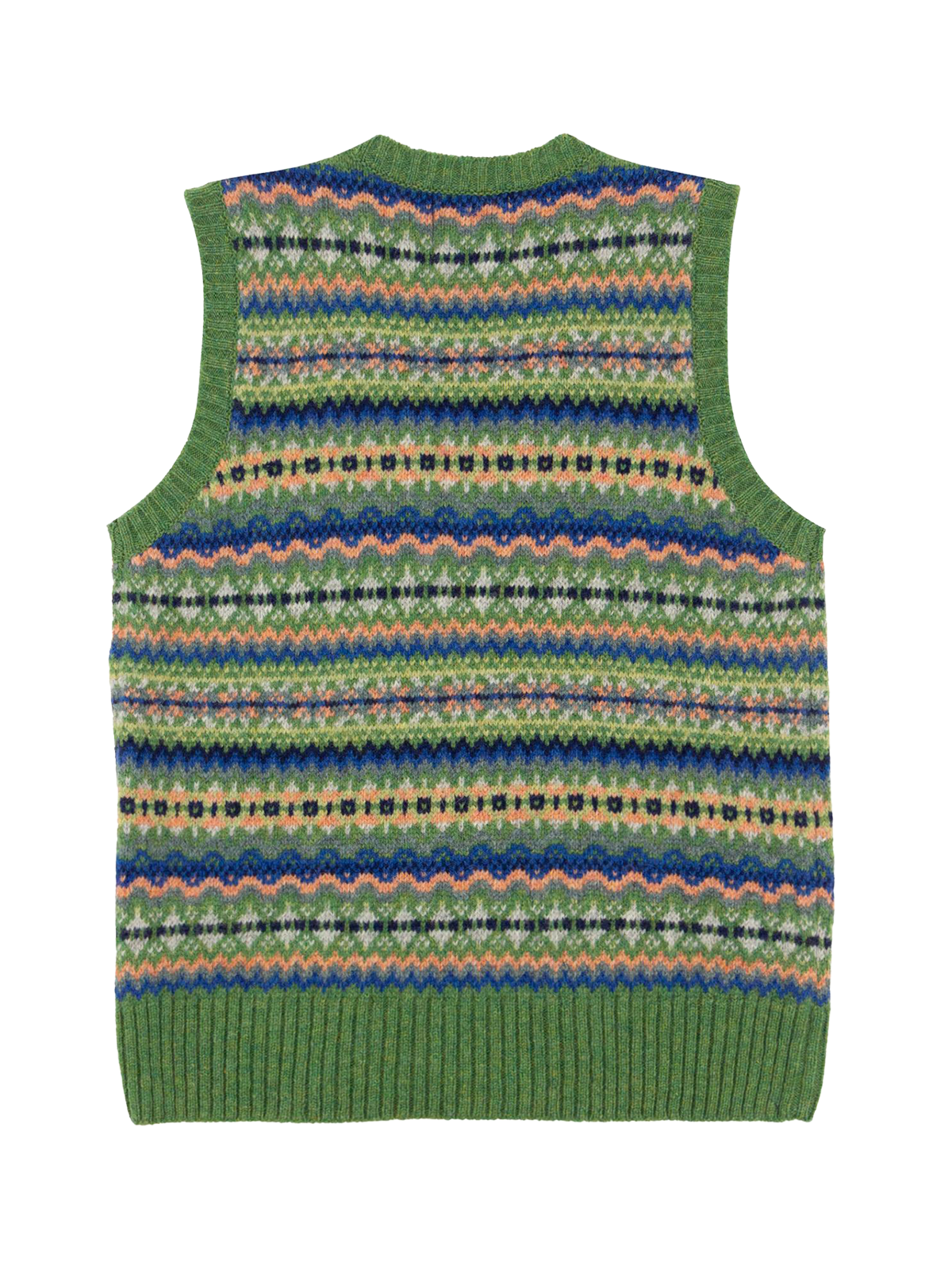 This particular style is a sleeveless V-neck tank top or vest in a lush grass green colour, with accents of coral, light grey and blue.
