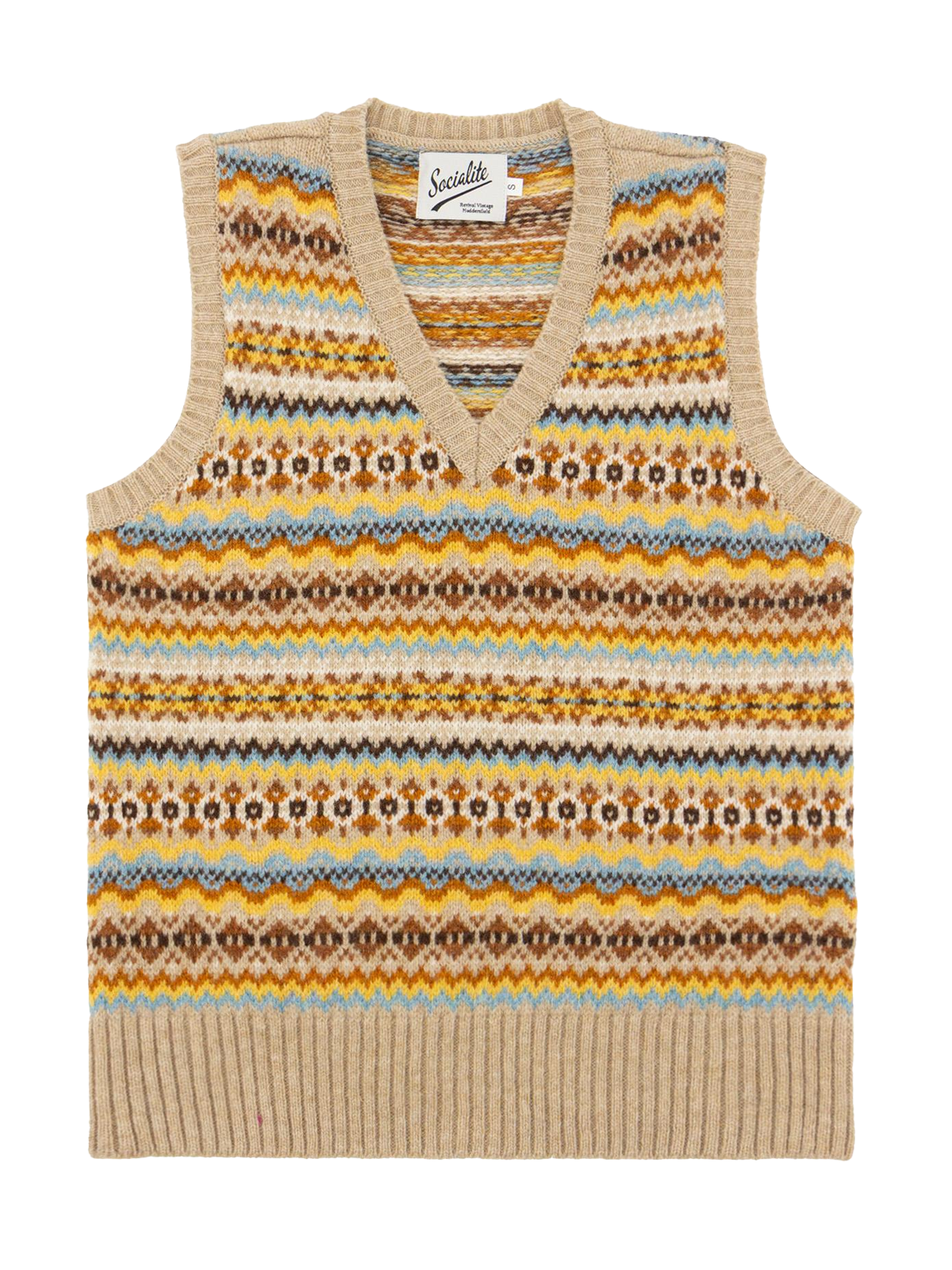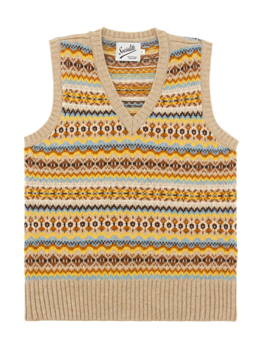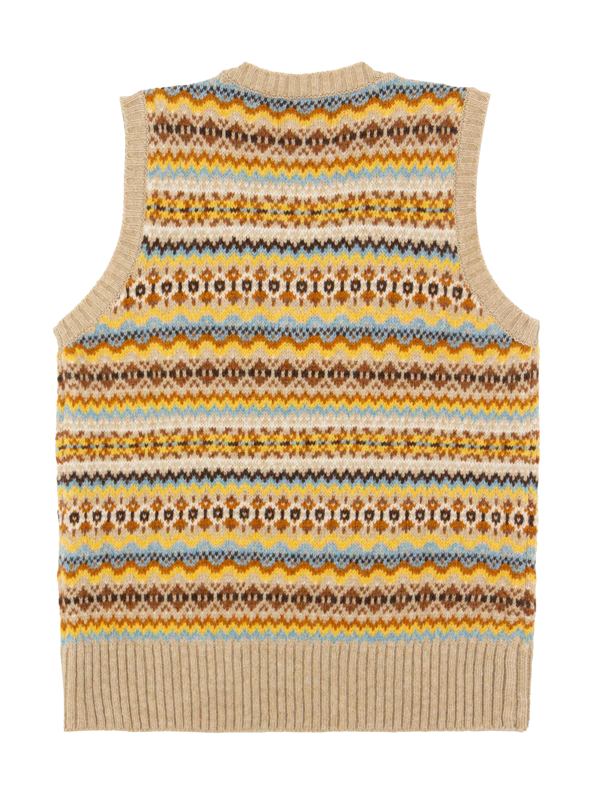 This particular style is a sleeveless V-neck tank top or vest in sandy beige, with accents of yellow, sky blue and burnt orange.