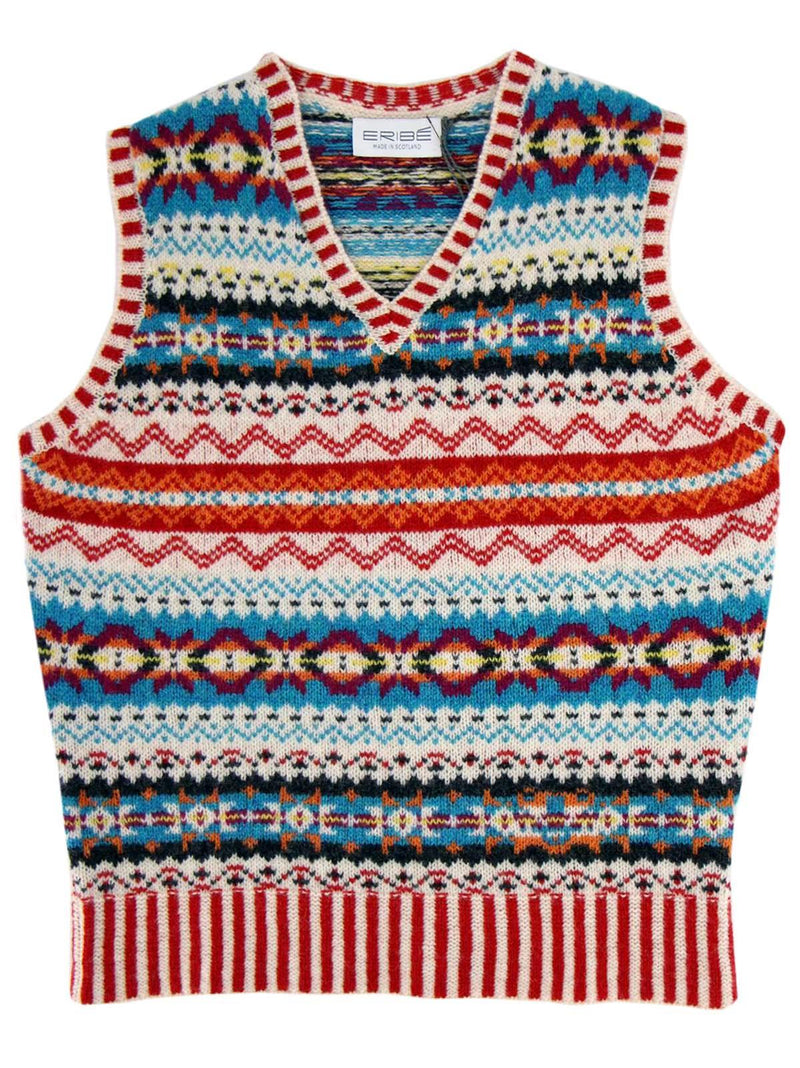This sleeveless sweater vest is made of soft Shetland wool, woven in a Fairisle pattern that gives it a classic 40s look. Hand-produced in Scotland using quality, natural yarns spun that keep you truly warm, by ERIBÉ, an established knitwear design house and manufacturer that has been in operation for 33 years.