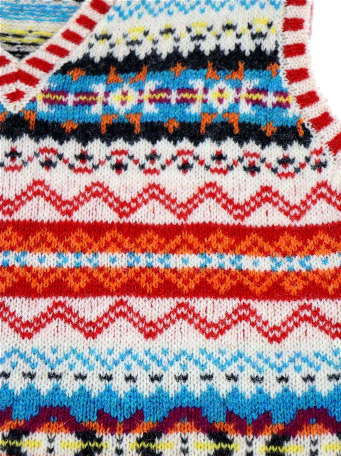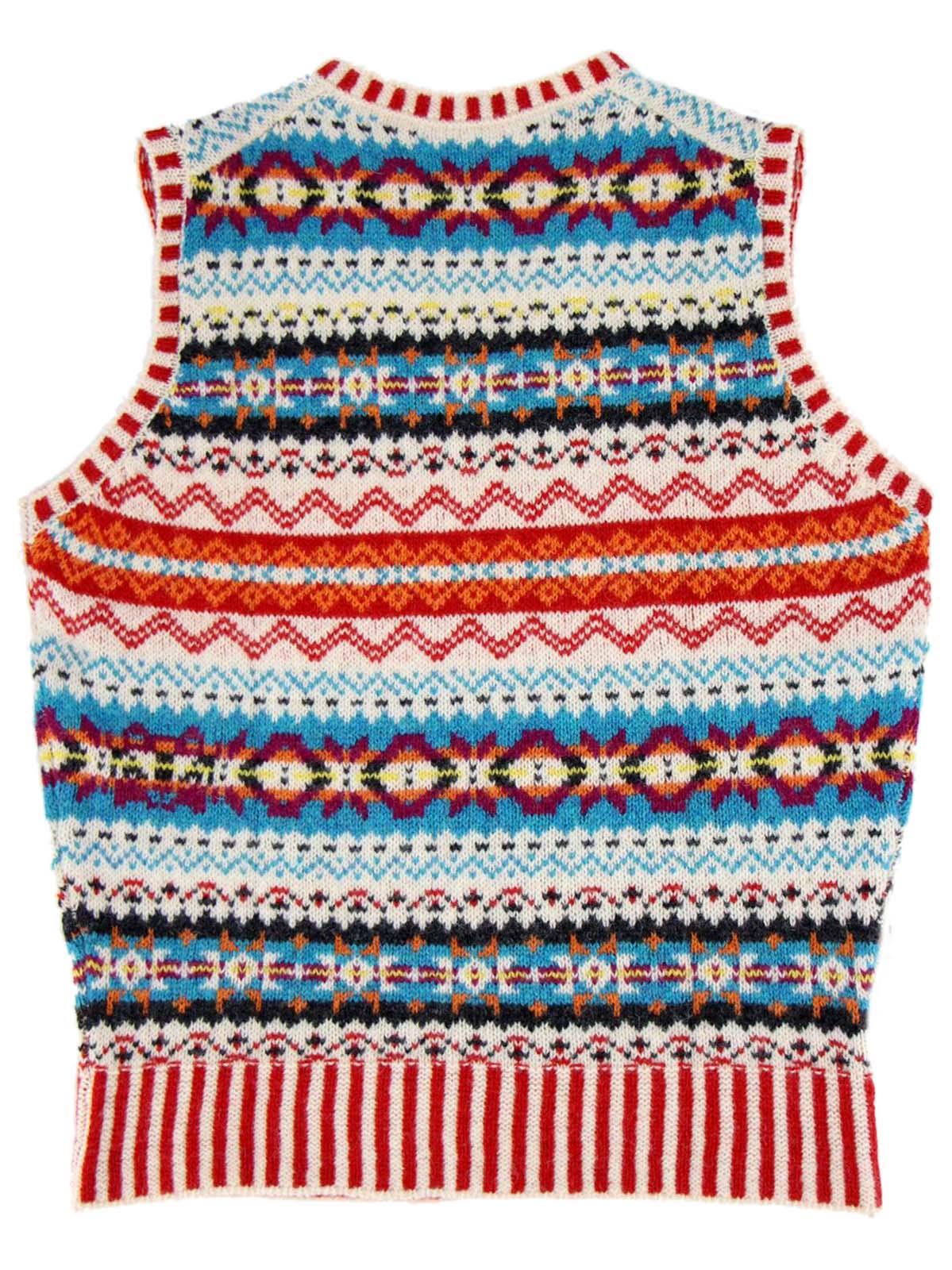 The Firecracker red tank top features rows of Fairisle patterning and stripes across the V-shaped neck, as well as on the bottom hem. This colourway is a mix of cream, blue, orange and red shades.