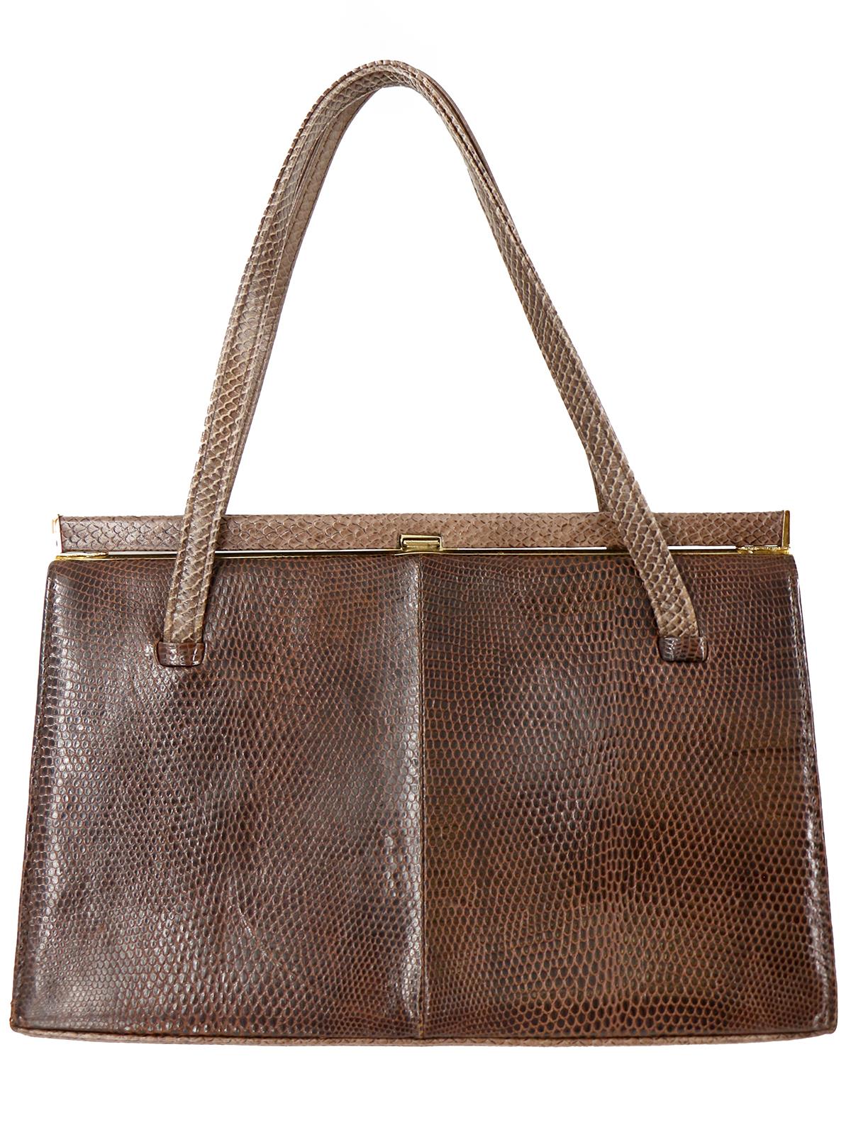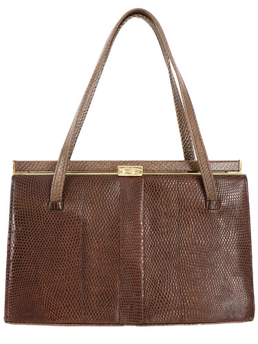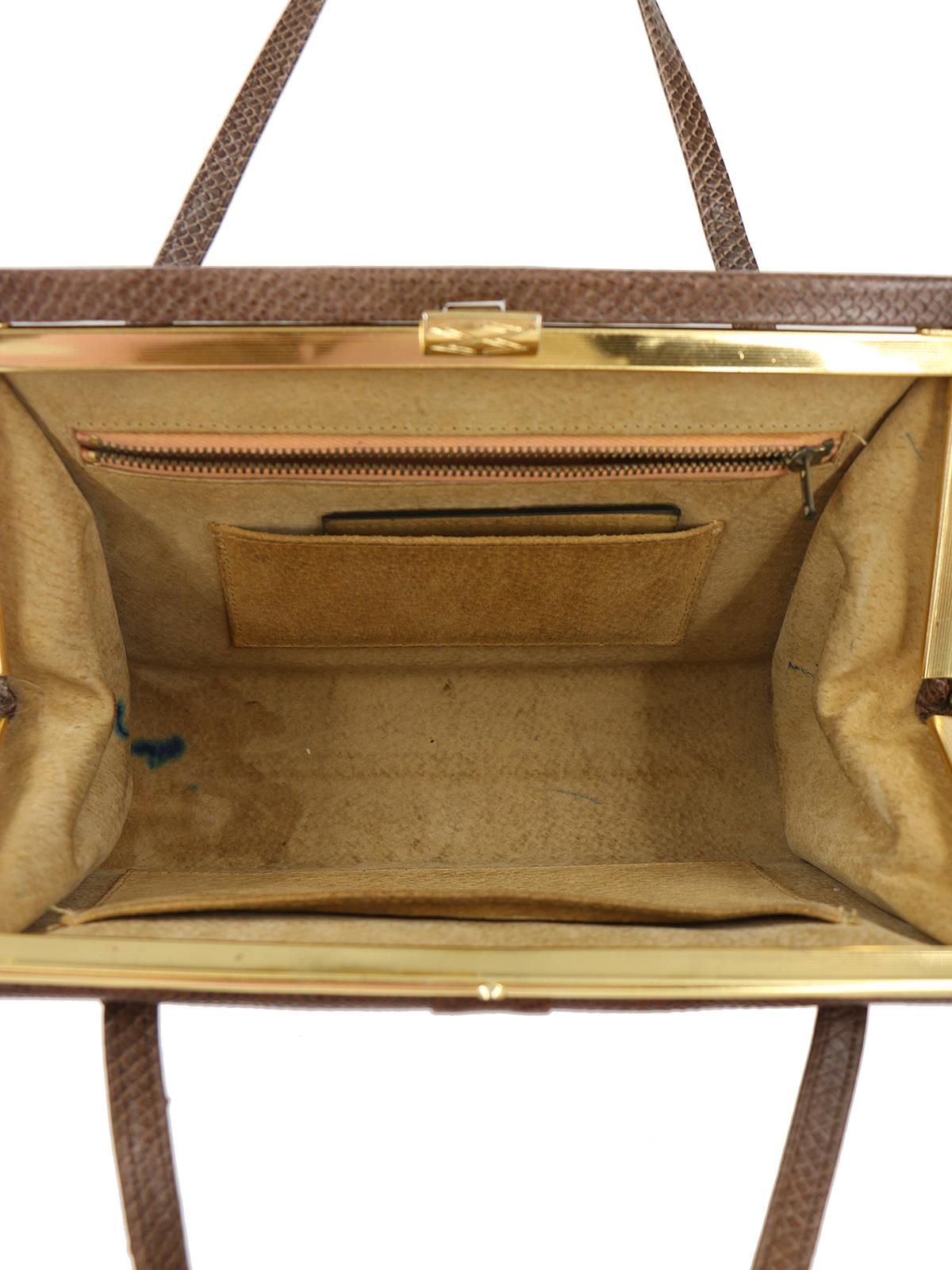 Small vintage bag in a definitive frame style, realised in rich brown lizard skin; the hue is slightly lighter on the handles, top bar, and base.