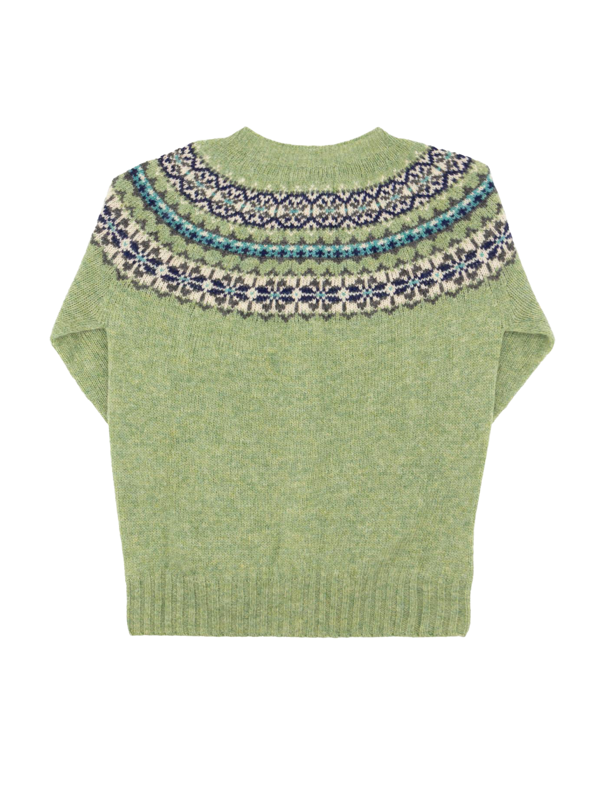 Authentic forties look cardigan in sage green, with teal, navy and cream highlights in its Fairisle pattern. Handmade in a traditional knitting method which takes its inspiration from forties and fifties fashion, with deep welts and pearl buttons.