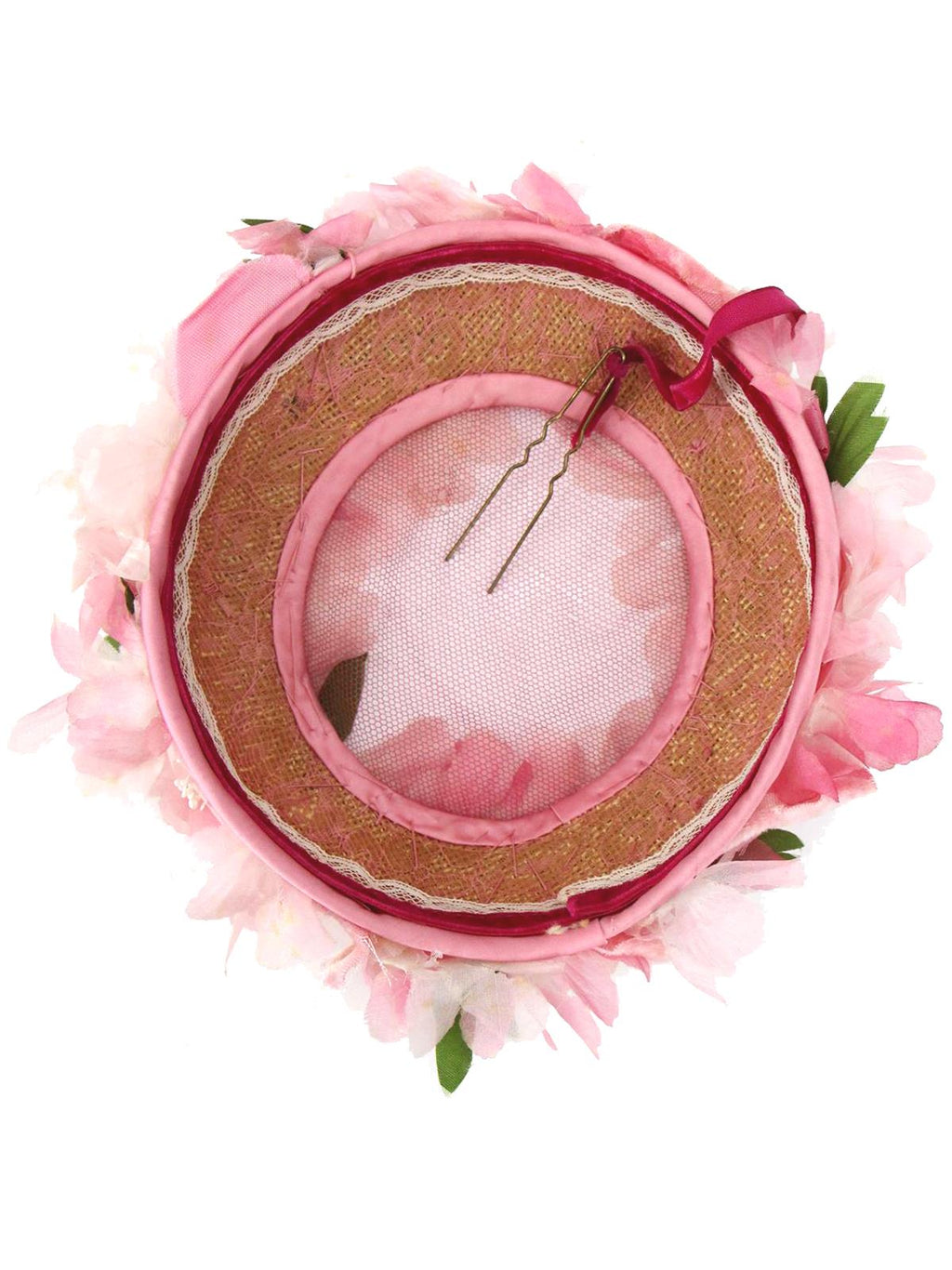 Add a delicate flowery accent to your vintage outfit with this original 1950s / 60s wreath hat. The stiff circlet frame is covered with fine pink netting, velvet, and soft pink fabric flowers, accented with green leaves. A deep pink velvet ribbon with pin is attached to secure the hat on the head.