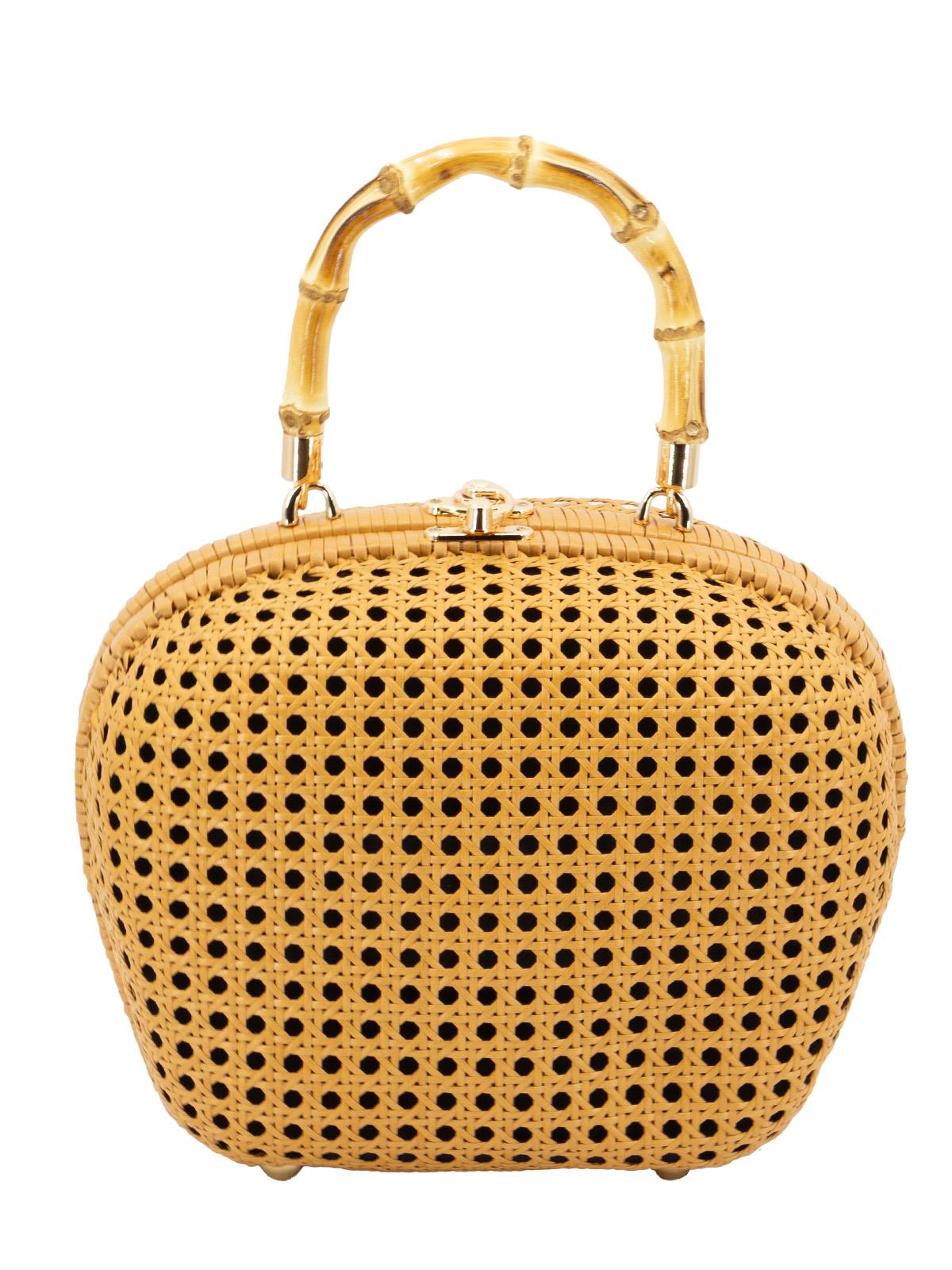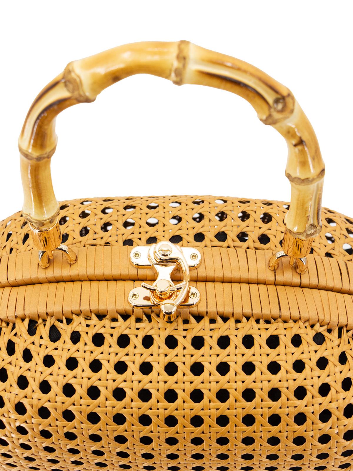 A period accurate replica accessory, crafted from natural rattan, perfect for pairing with your vintage summer outfits. It features a bamboo handle and a hinged gold metal clasp fastening. The design is an exact copy of an original vintage bag we sourced from America.