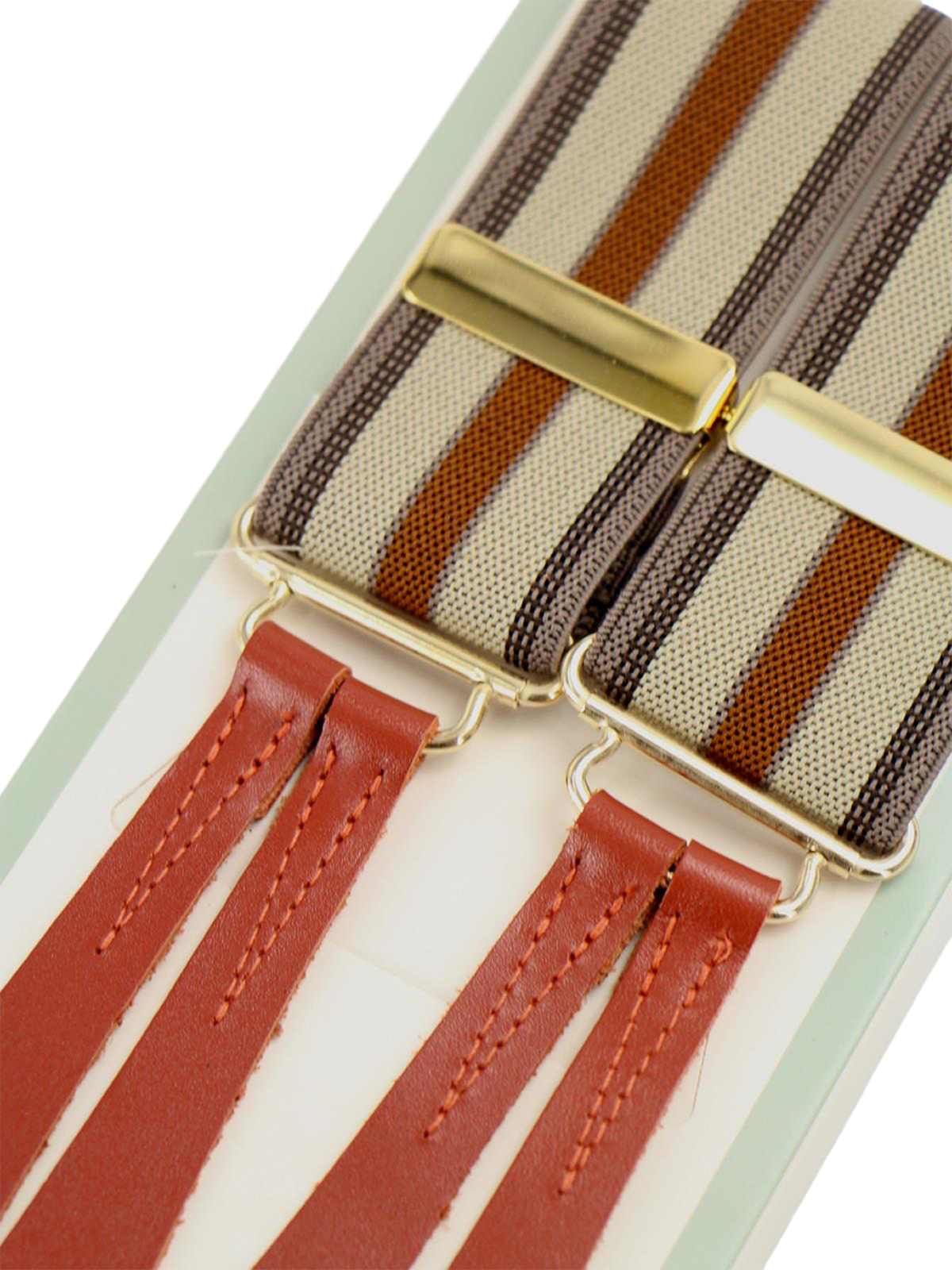 Handmade high quality vintage style trouser braces in a cream, brown, and tan stripe, finished with tan leather loops for attaching to trouser waist buttons. Adjustable with gold gilt closures, these premium quality braces are cut in a classic ‘Y’ back design.