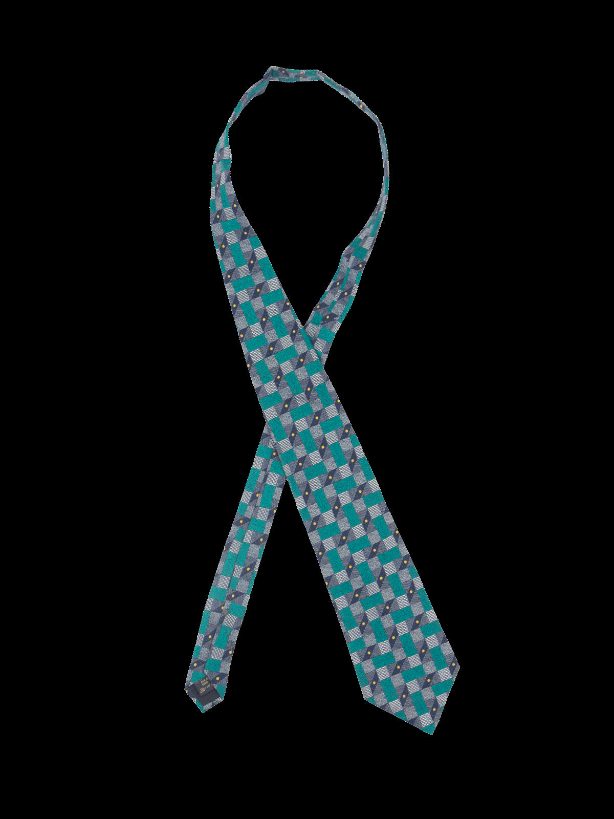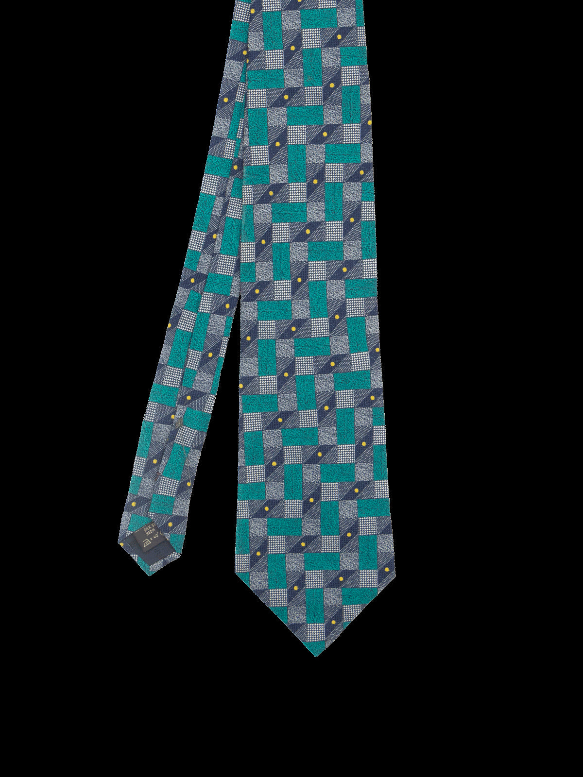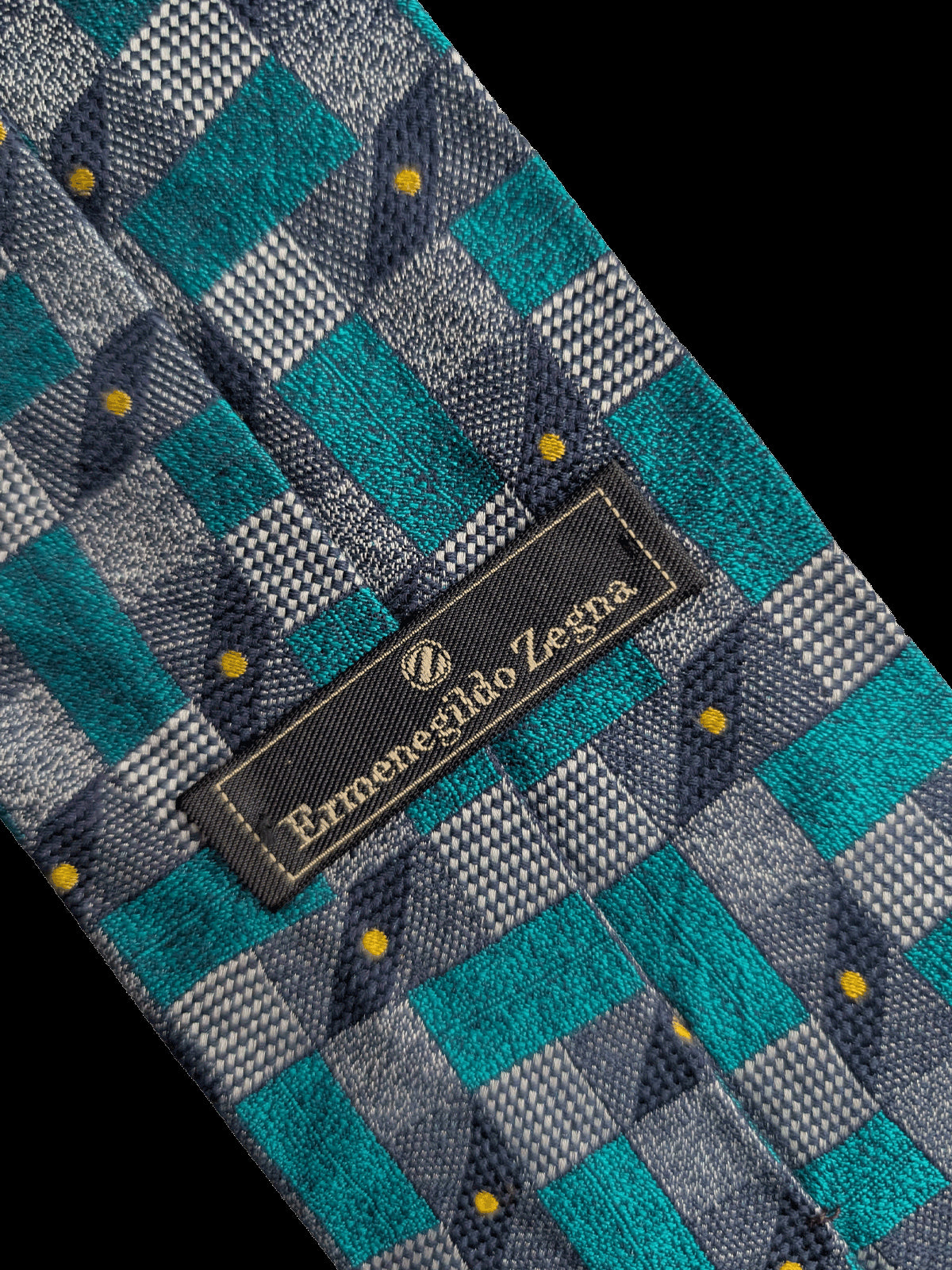 A quality true vintage silk tie, featuring a geometric check repeat design in teal, grey, and dark blue with small mustard yellow accents. The perfect accessory to add interest to any spearpoint collar shirt.