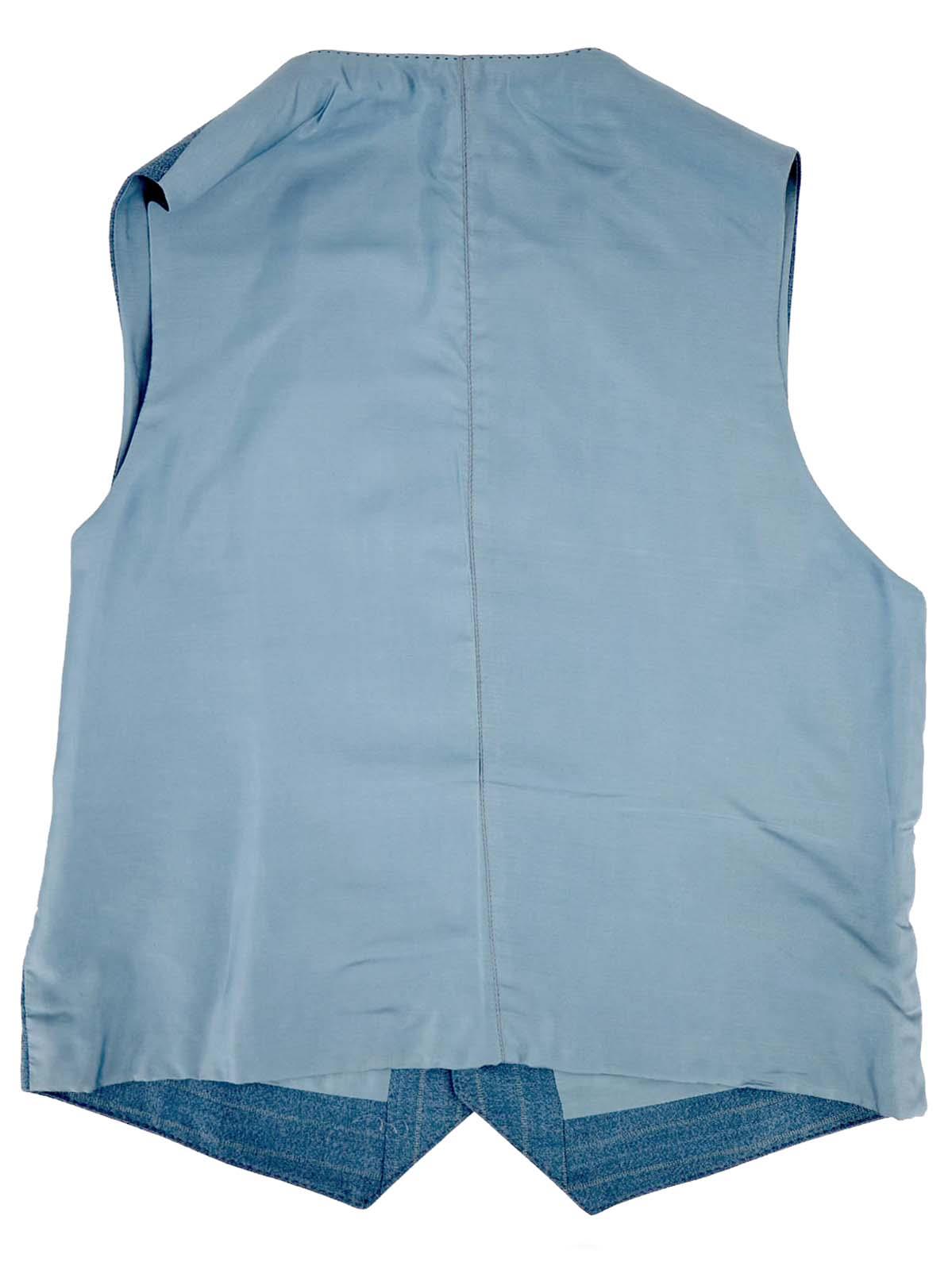 Its coordinating waistcoat is fastened with six buttons, and features two jetted pockets and a satin back.