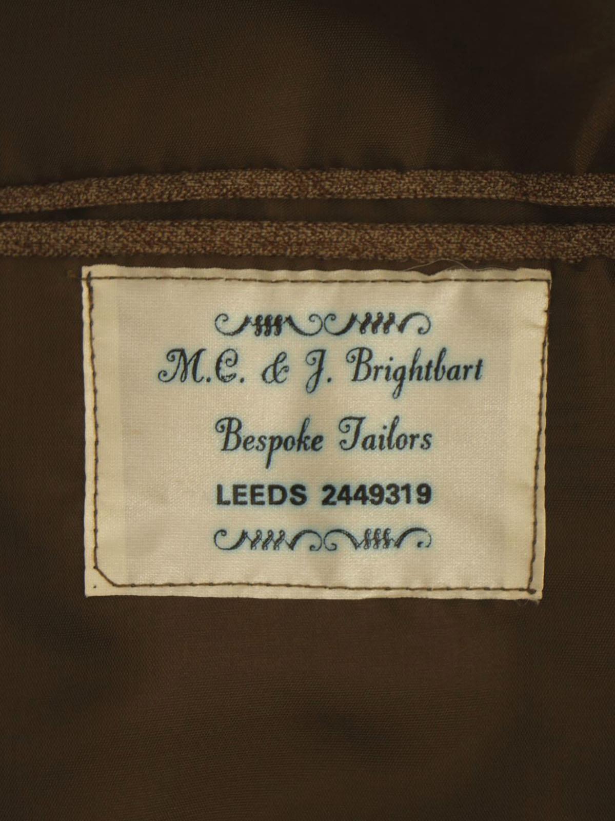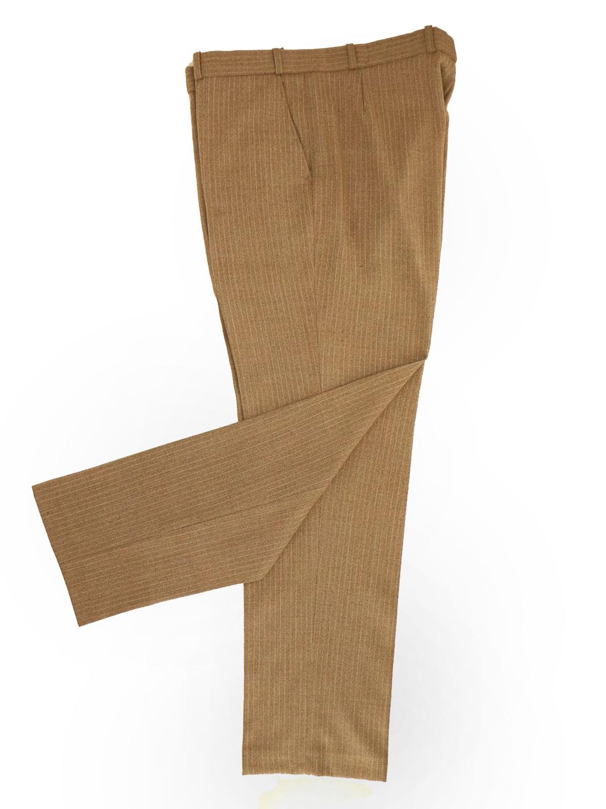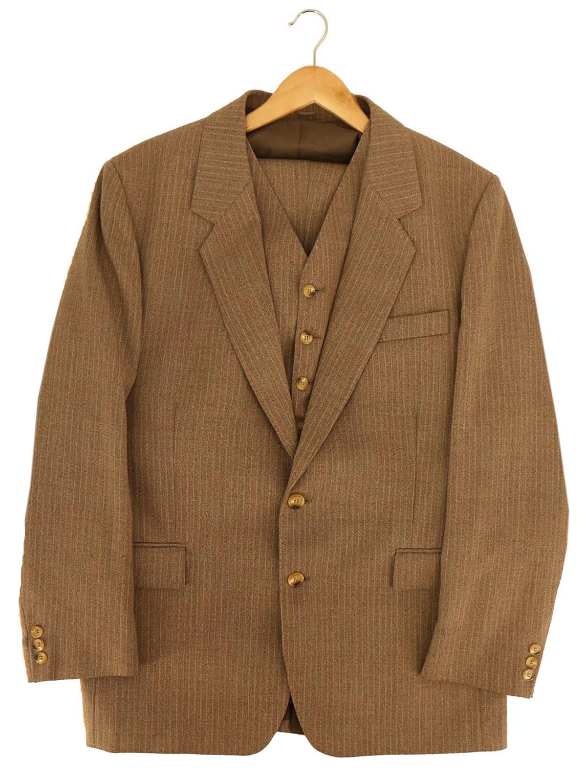 True vintage suit in a beige biscuit shade with pale pinstripes.