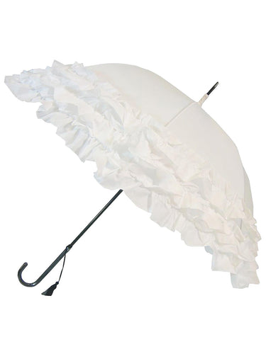Sweet retro look parasol umbrella with layers of frilled texture in a timeless white shade. Black crook handle.