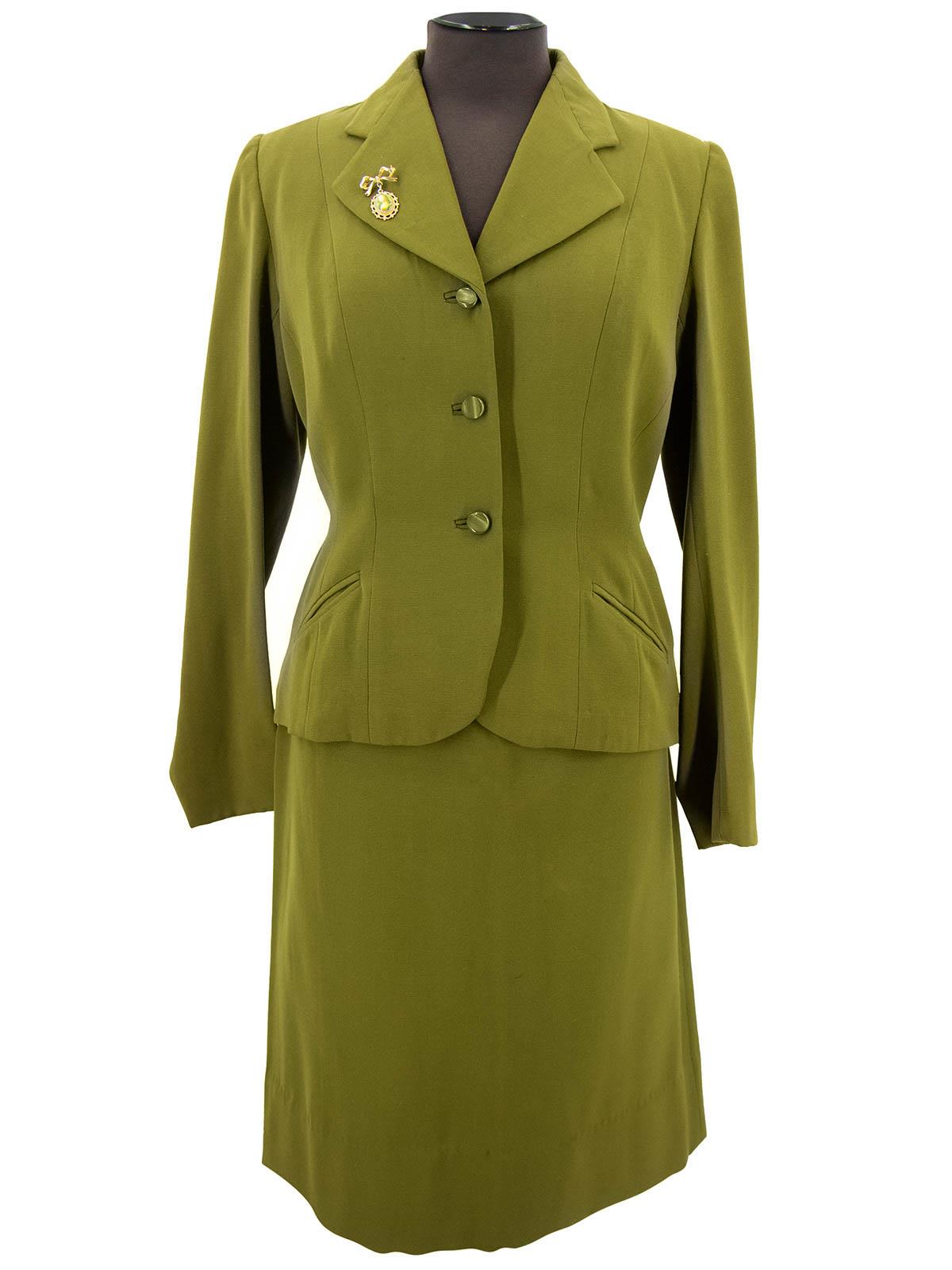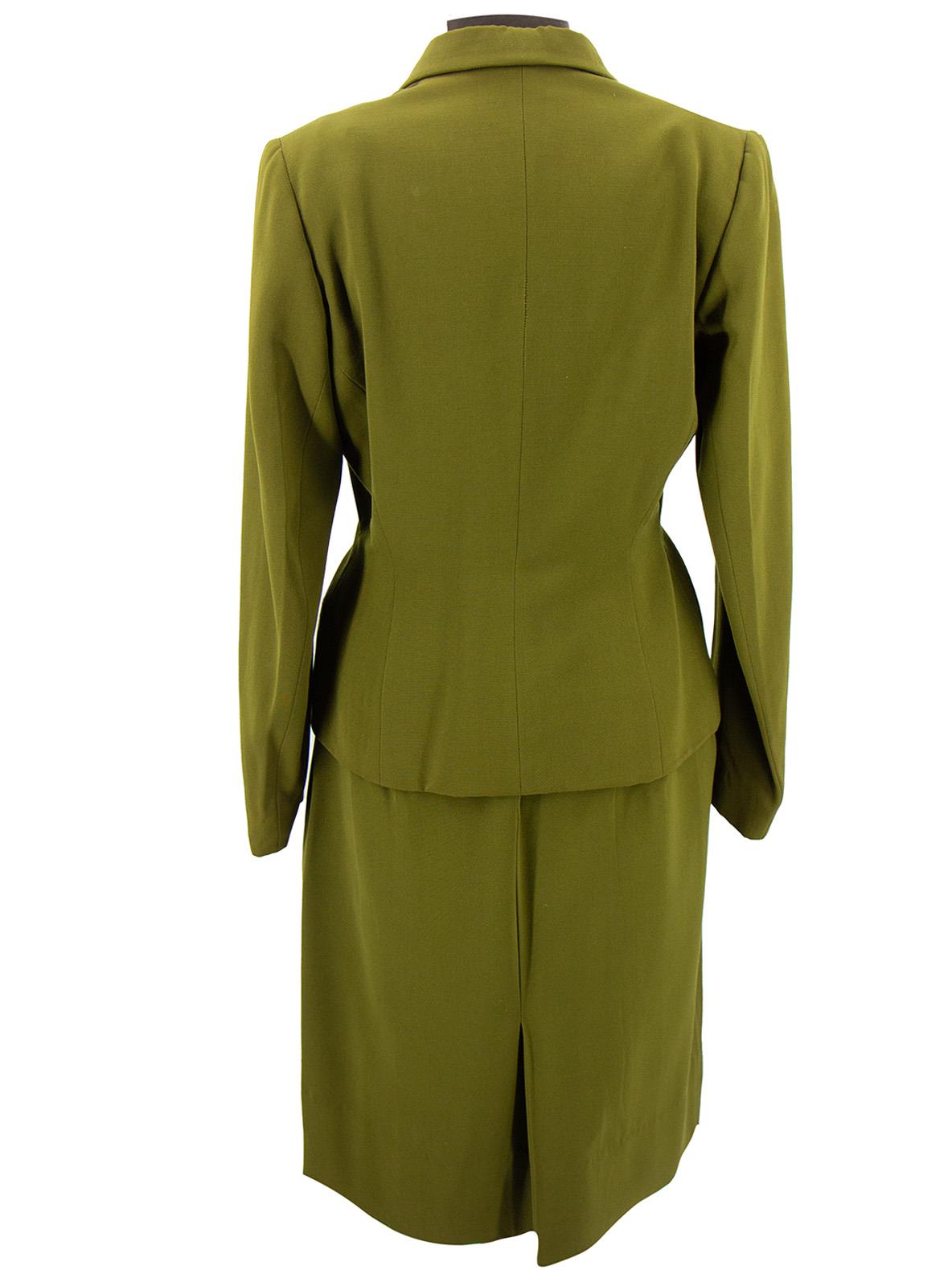 This olive green forties skirt suit is made from a high-quality worsted wool and designed by Aireton. This true vintage jacket is shaped beautifully to give a period silhouette, with feminine pockets to the front, and lined in a matching crepe fabric with striped piping detail.