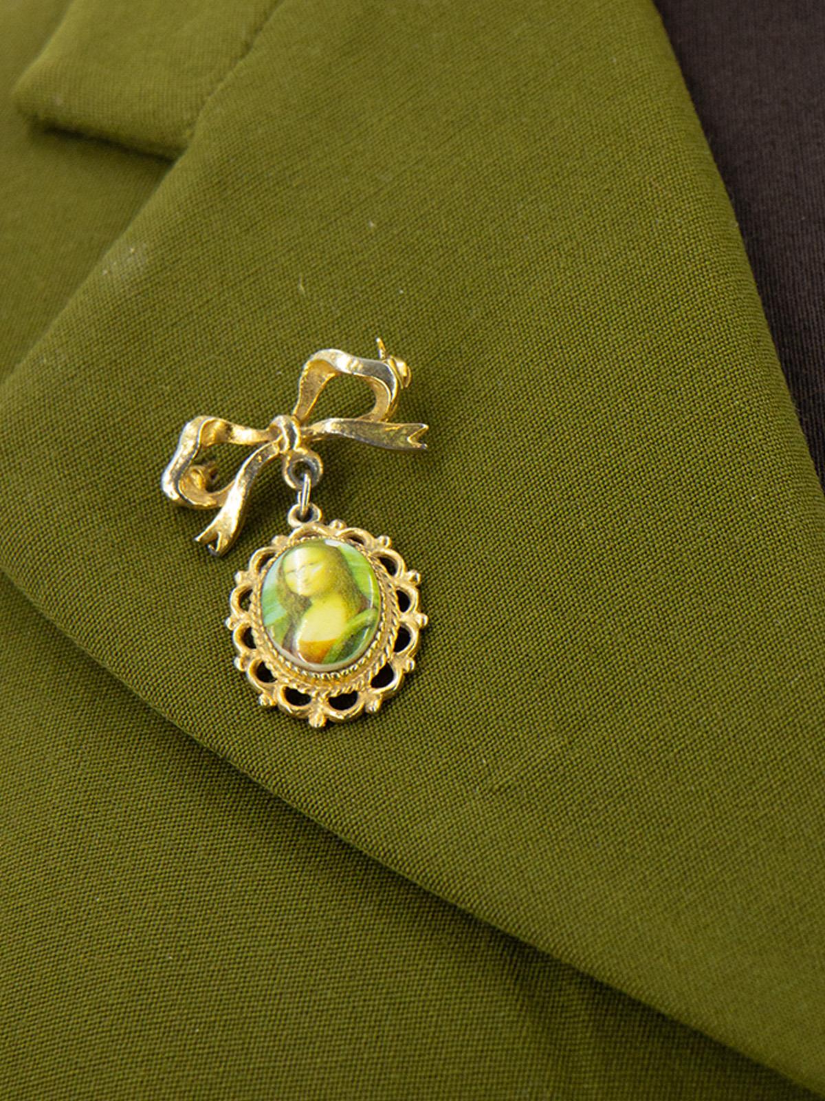 The jacket has a three-button fastening and there is a small hole to the right lapel of the suit jacket (please see photograph), but it's in a spot that makes it easily hidden with a brooch, as shown. The pictured brooch is included with this purchase. There is also a slight scuff to one shoulder.