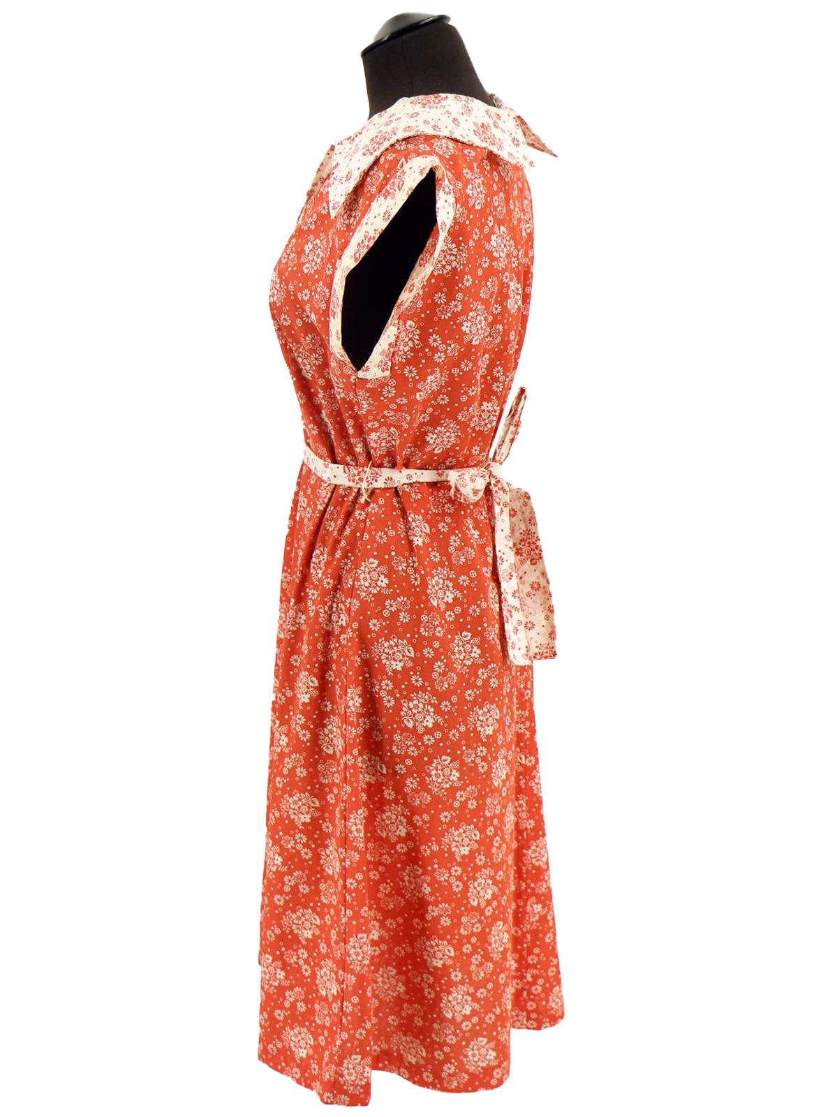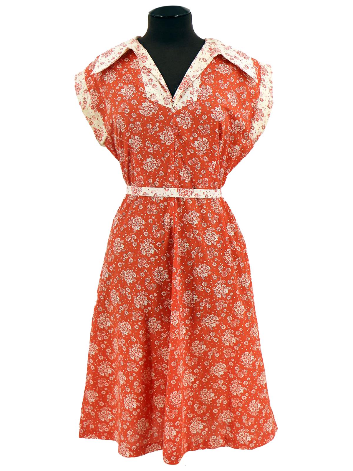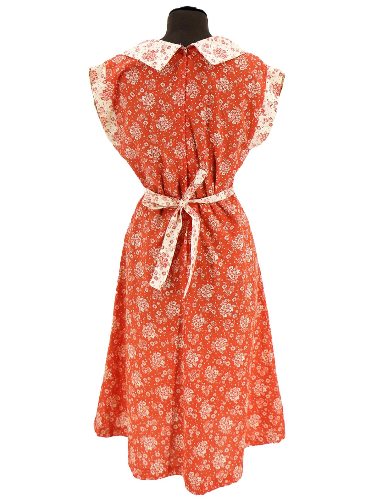 This seventies-era dress is made from durable, high-quality patterned cotton in a bold vermillion colour, with a floral pattern in contrasting ivory.