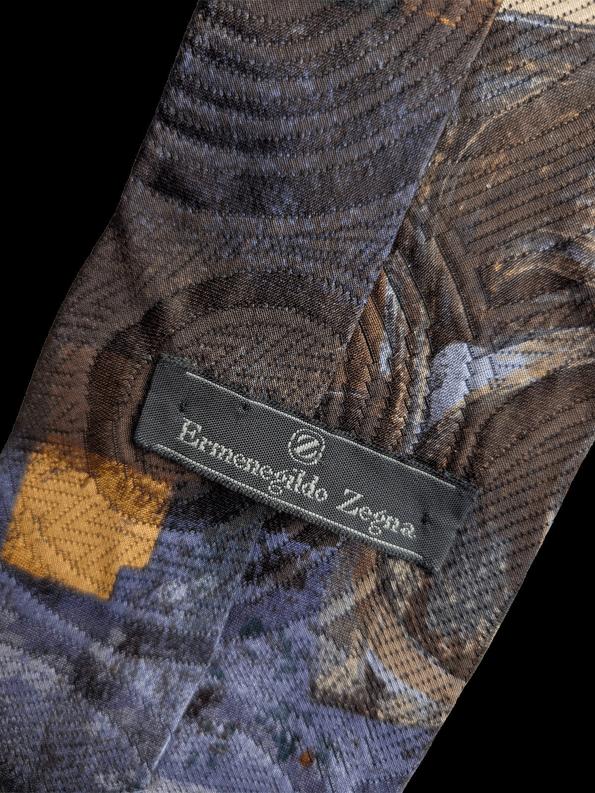 A designer tie with the quality you would expect from Ermenegildo Zegna label. Featuring an eye catching large scale abstract repeat design of fluid shapes, spirals, and geometric blocks in tonal brown & dark blue. A classic tie to coordinate with midcentury clothing.