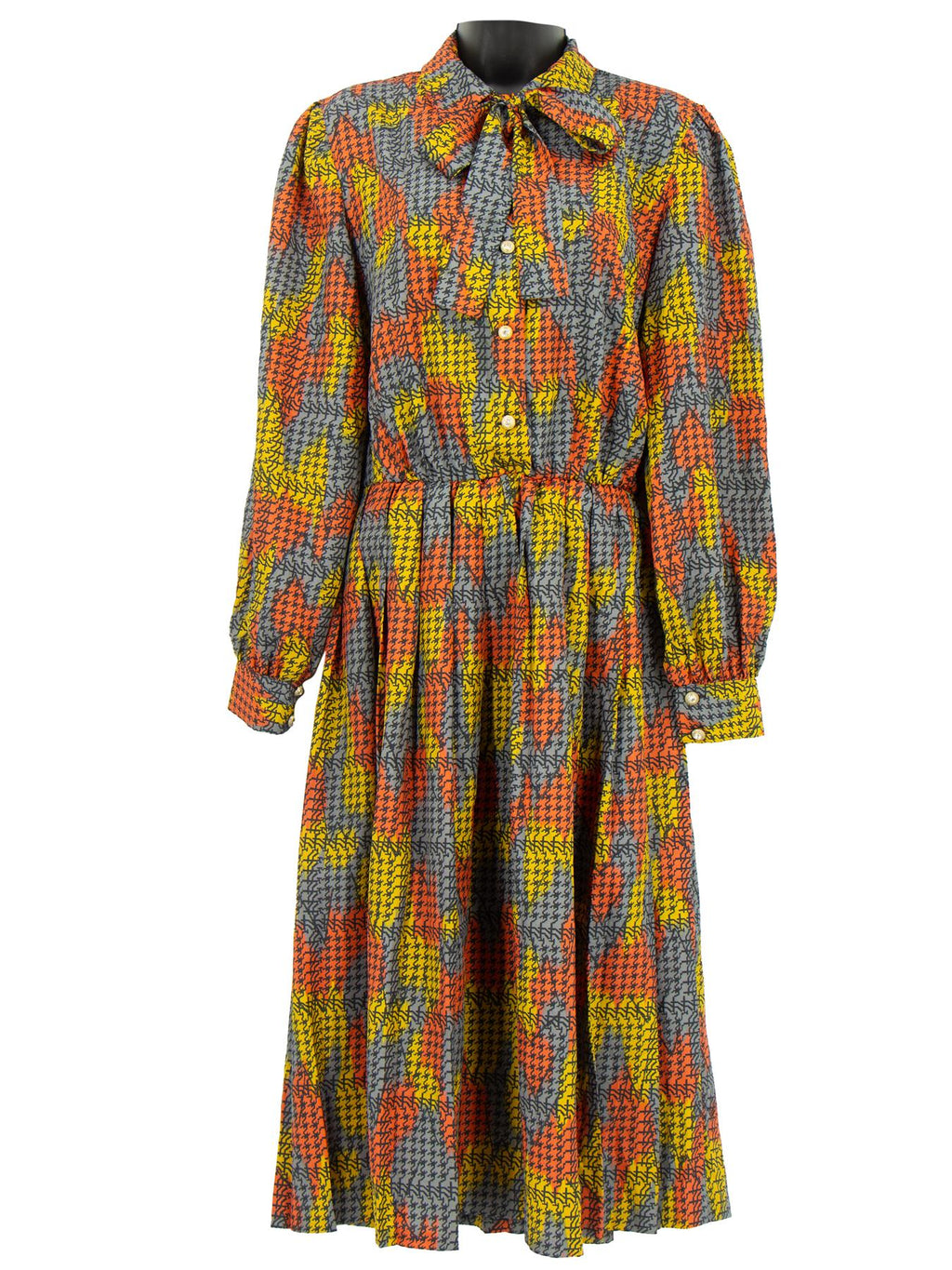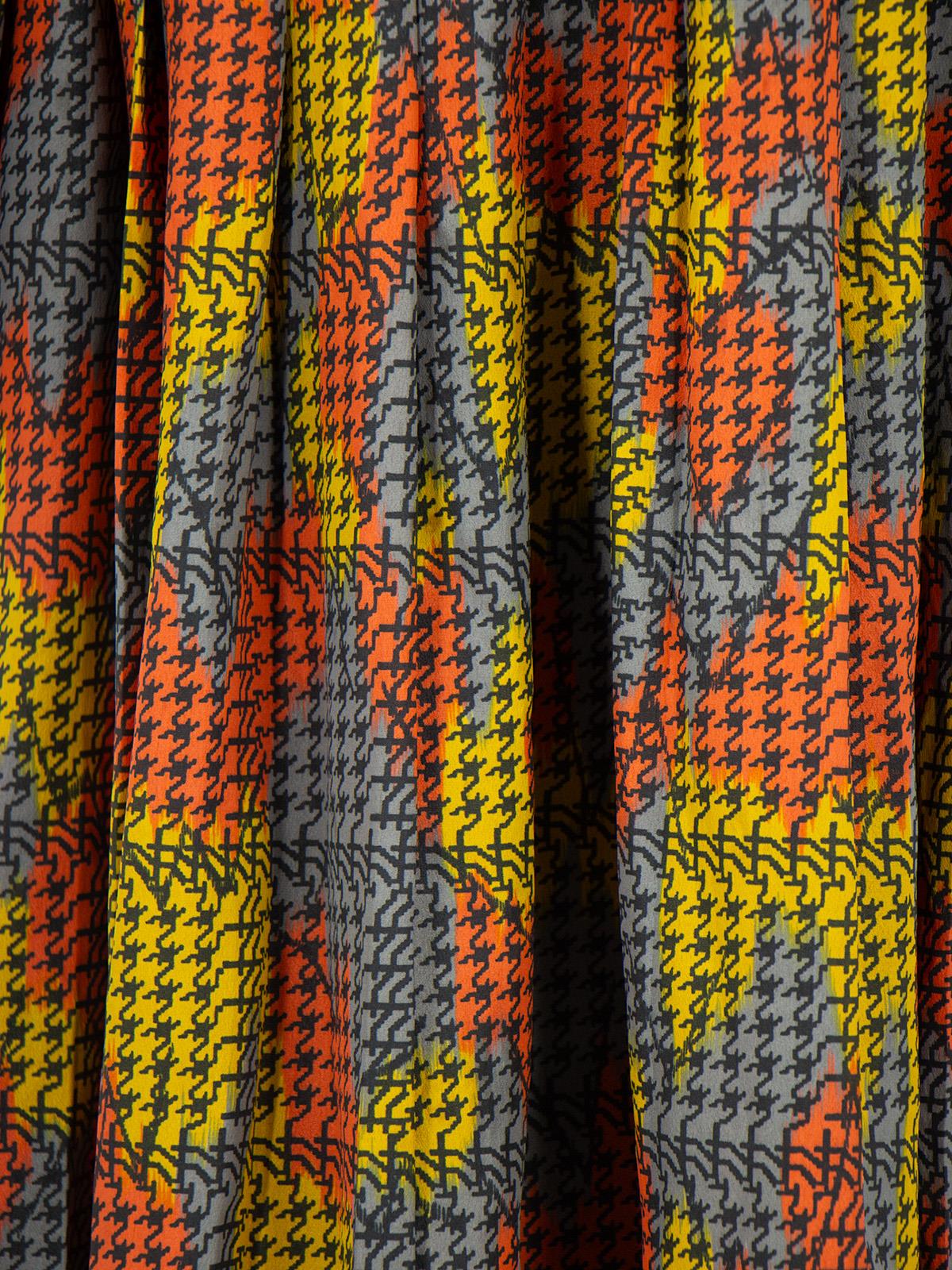 The autumn-themed palette of ochre, orange, and grey provide relief for the houndstooth pattern running over the dress.