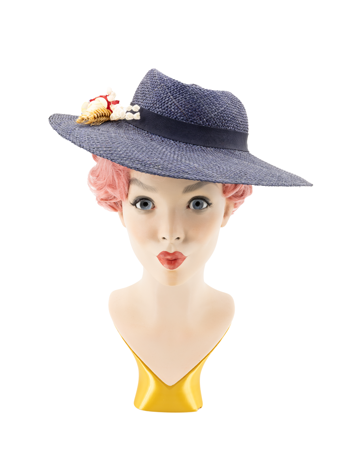 This Italian made straw hat is a deep navy with a structured silhouette, it serves as an ideal authentic looking accessory for 1940s inspired styling. While produced in the 1980s, this hat mirrors the 1940s aesthetics.
