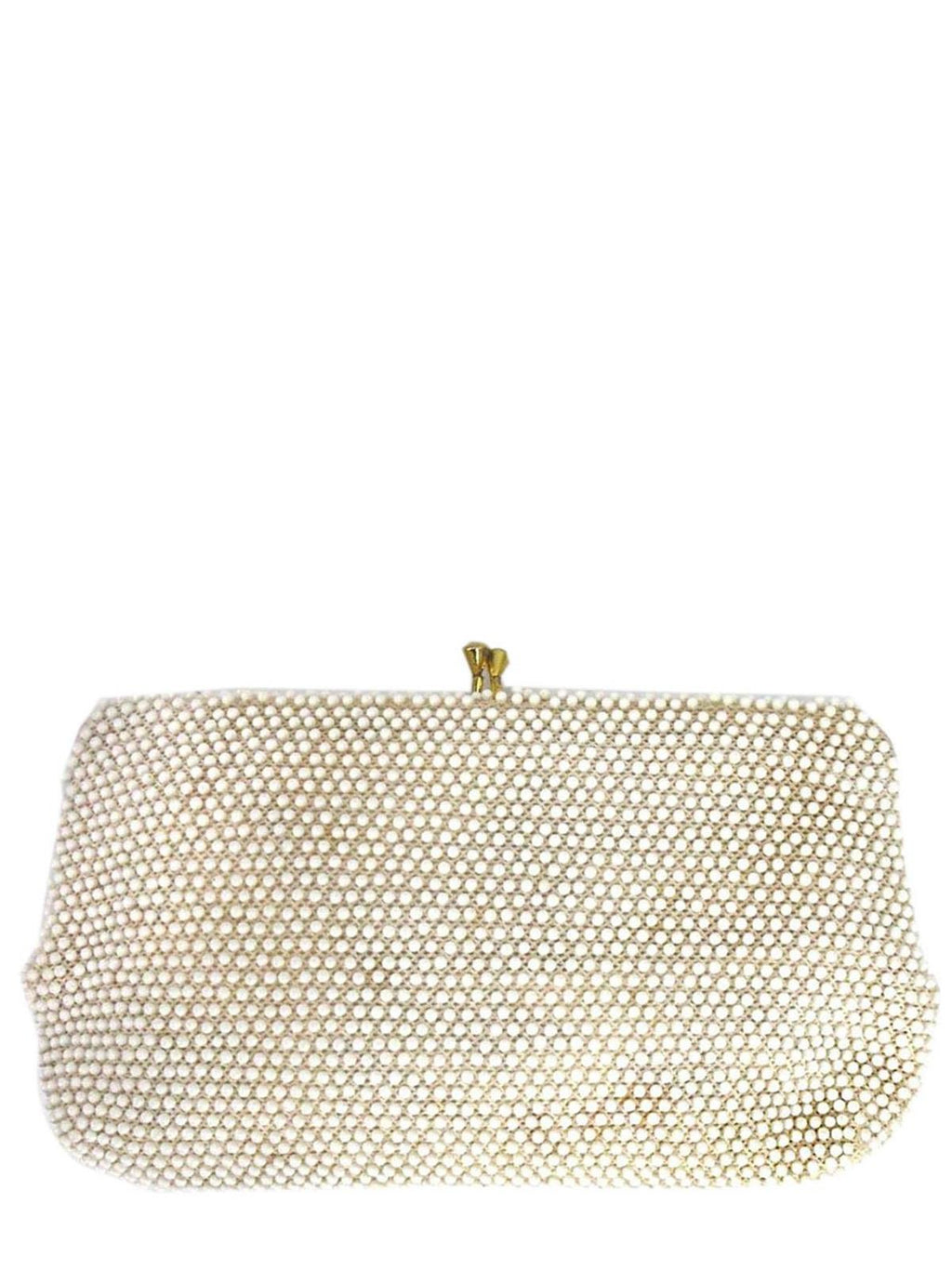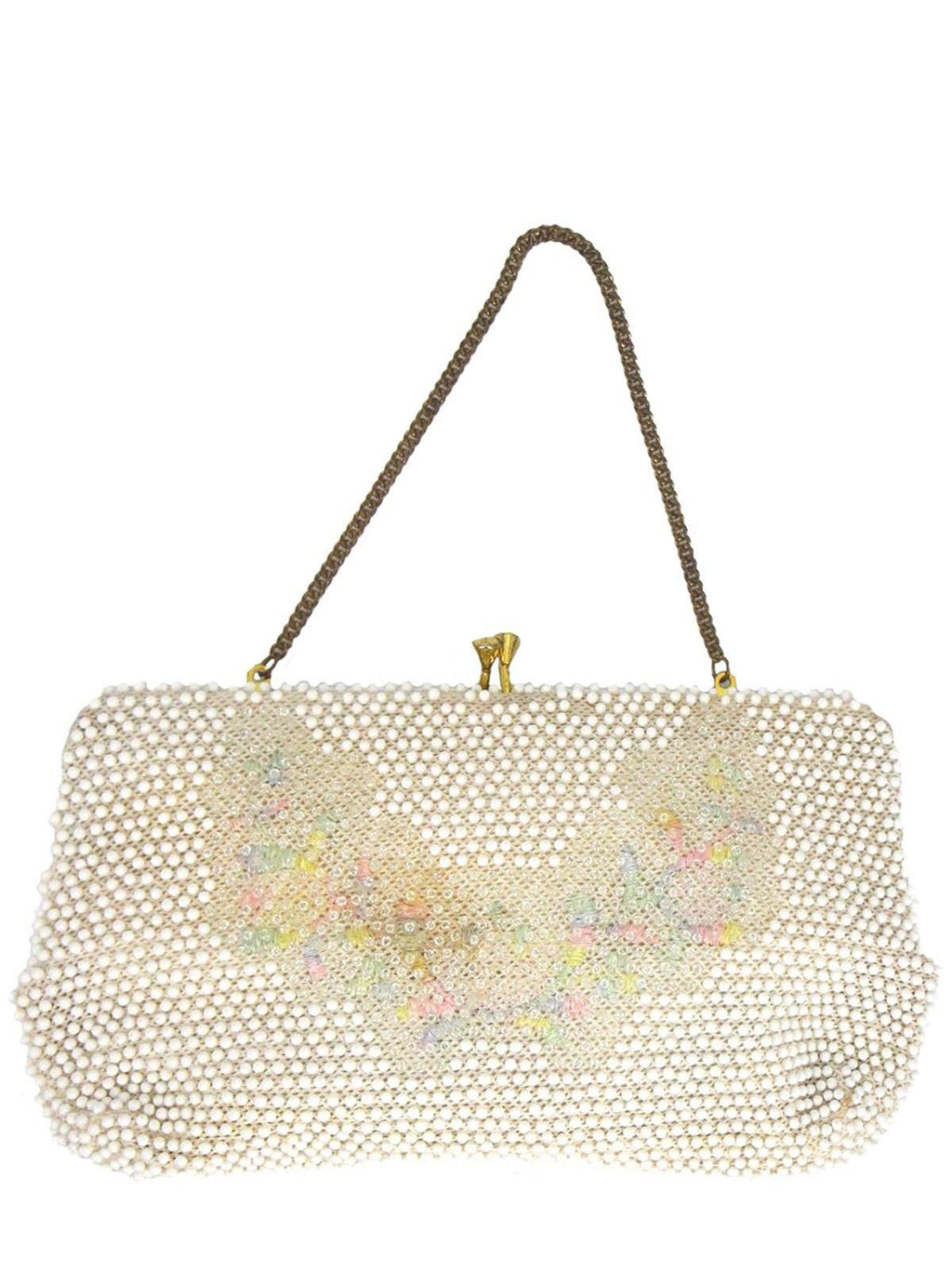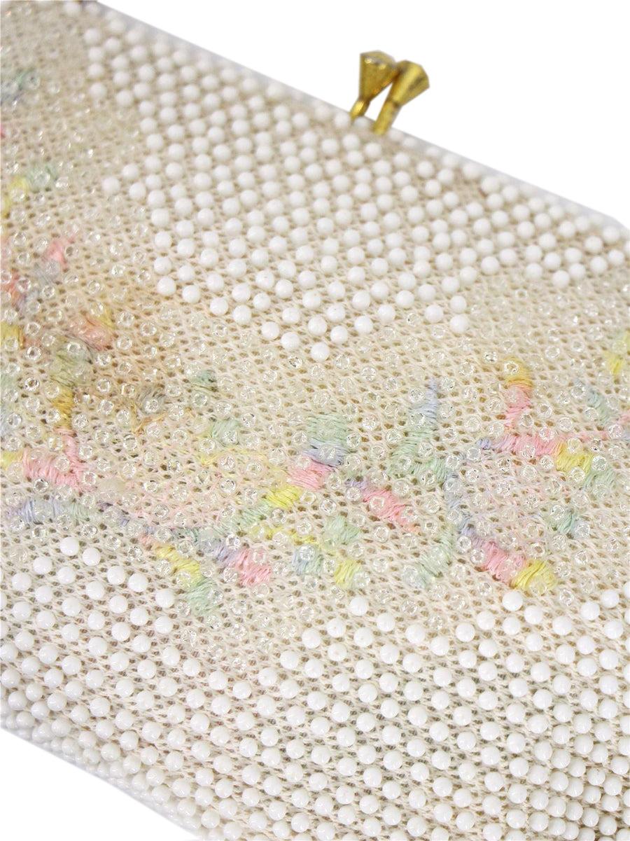 A sophisticated 1950s cream vintage clutch or evening bag with a gold frame and push clasp. It also has an optional gold chain for carrying. The front features pastel embroidery beneath a clear beaded panel, with the rest of the bag covered in cream beads. Inside is a cream lining with some small marks.