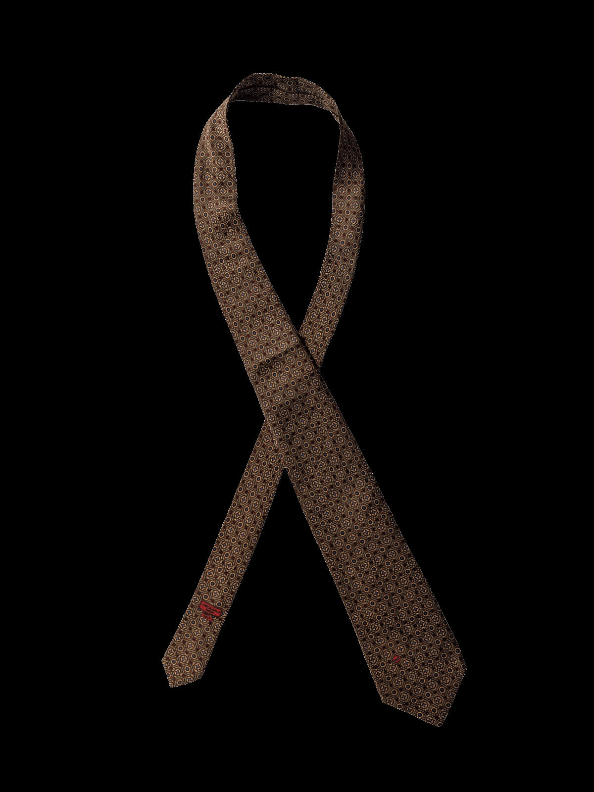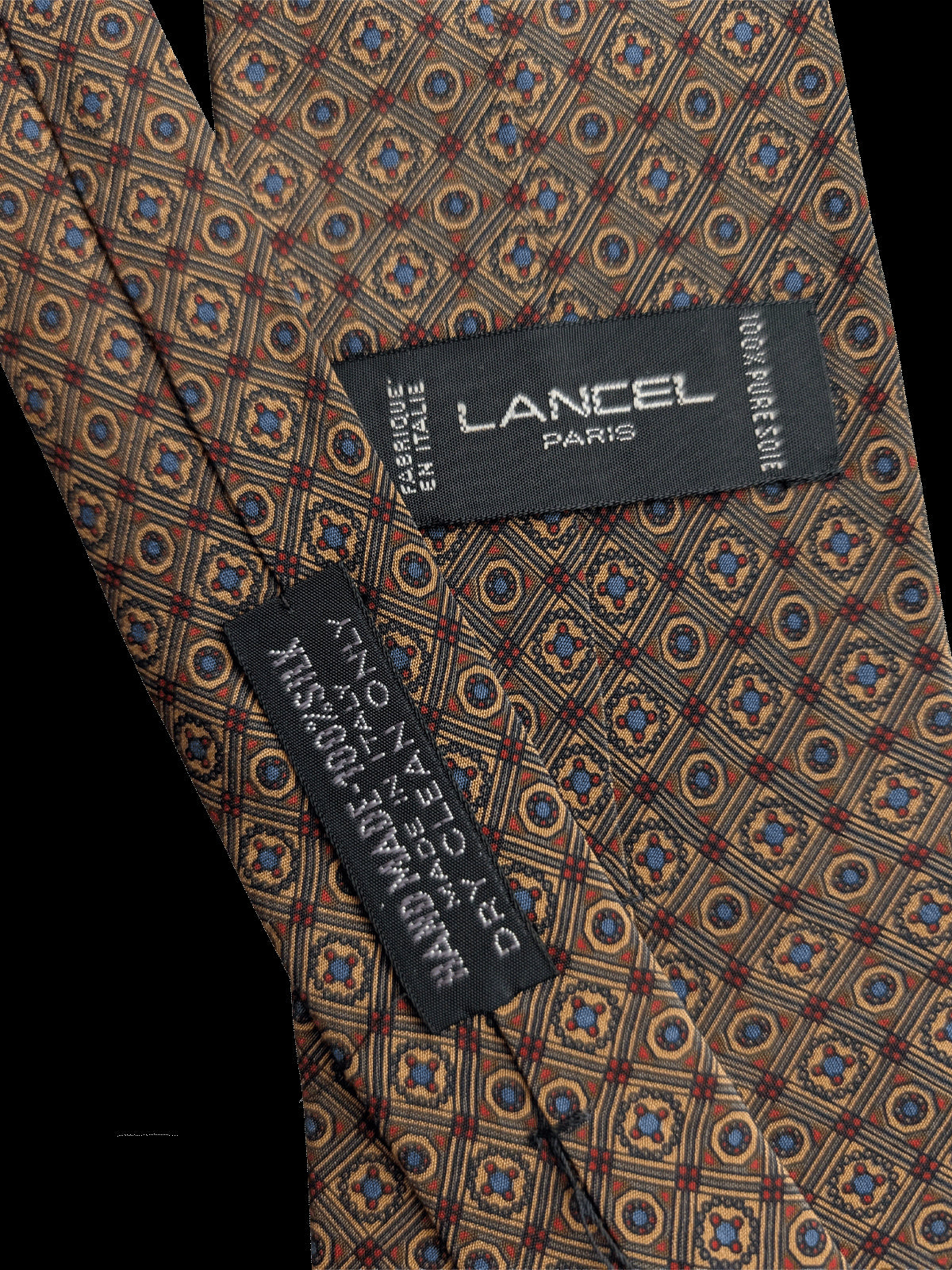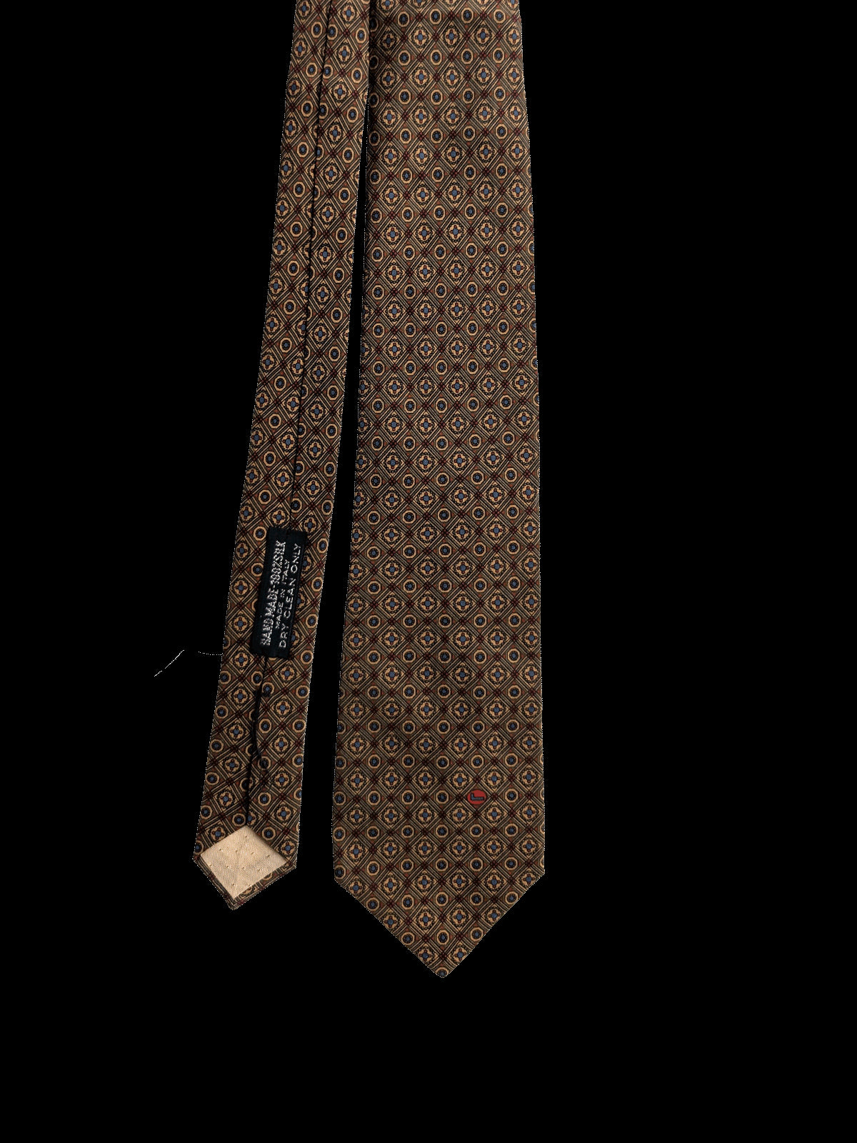 A quality true vintage silk tie, featuring a geometric repeat design in tonal browns, red and blue. A timeless accessory to add interest to spearpoint collar shirt.