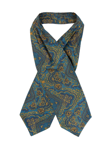 A dapper true vintage cravat in rich teal blue and navy, accented with gold baroque detailing.
