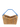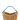 A natural woven wicker shopping basket with a classic midcentury look. Designed with a sturdy double handle bound in blue, it features matching blue accents on the basket body and distinctive V-shaped dipped sides. A practical yet stylish piece of vintage charm.