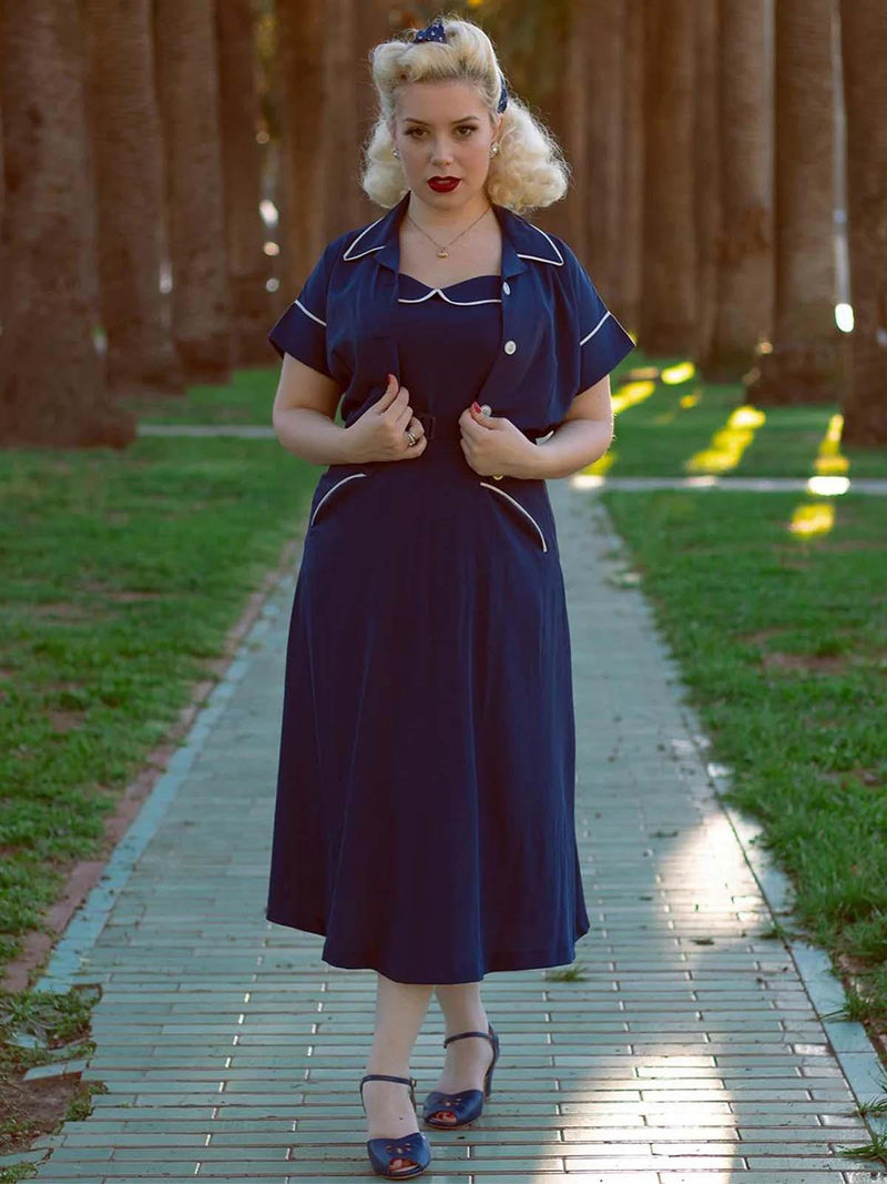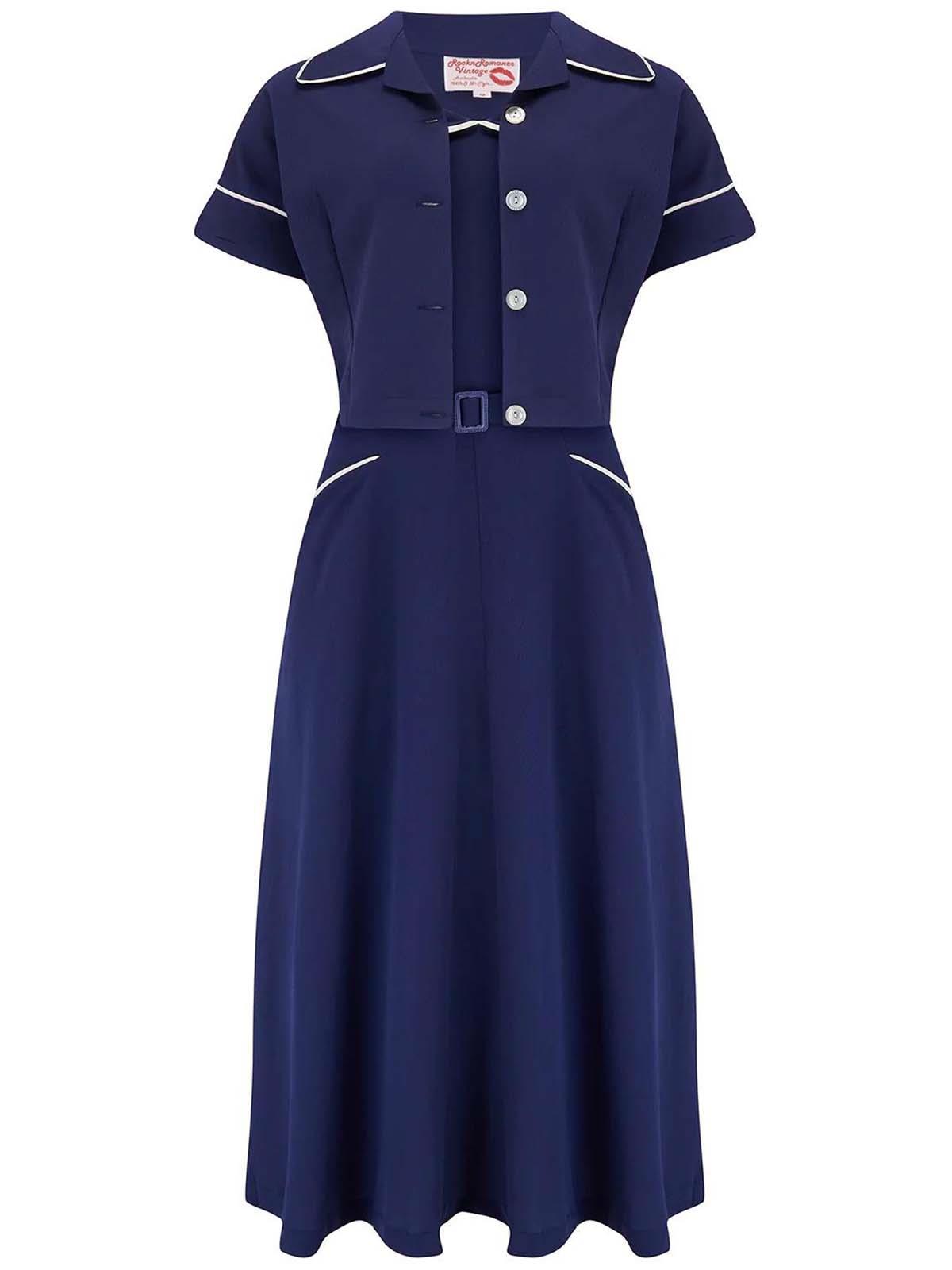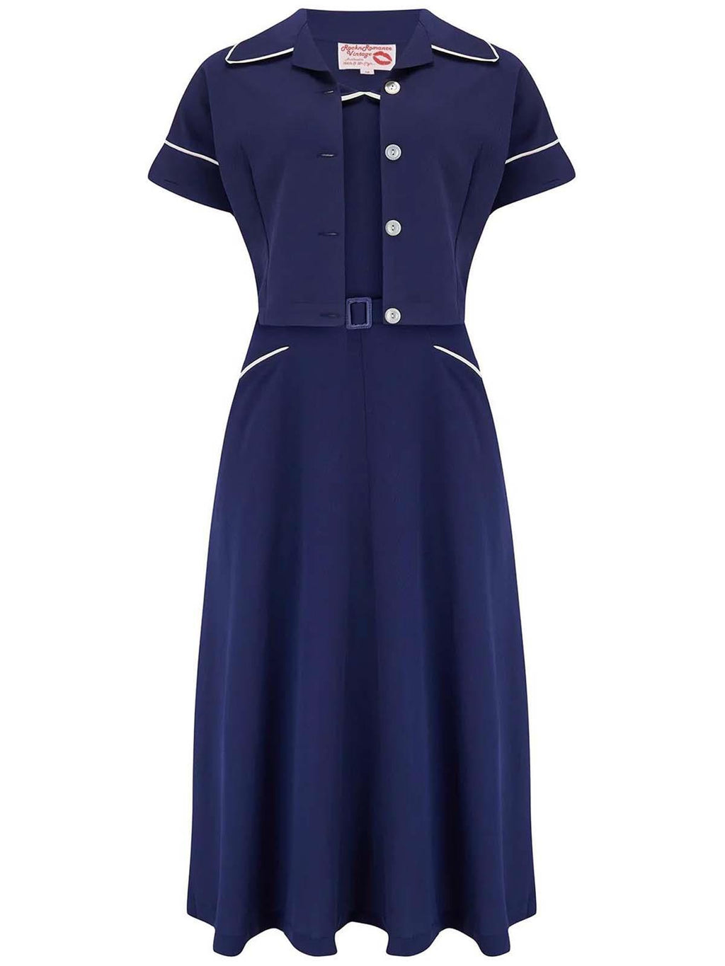 This simple and classic two-piece set is a brilliant vintage staple, comprosing of both a navy blue dress and a matching bolero that can be worn together or separately. This wonderful, easy to wear dress radiates authentic late 1940s to early 1950s style with its cute sweetheart neckline, matching fabric belt, and ivory contrast piping.