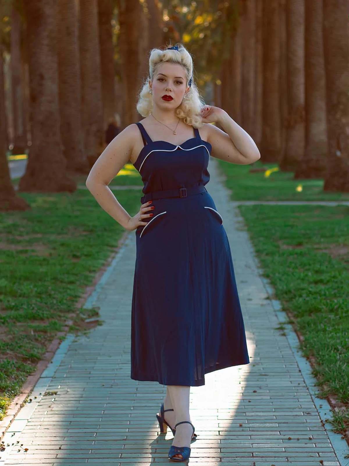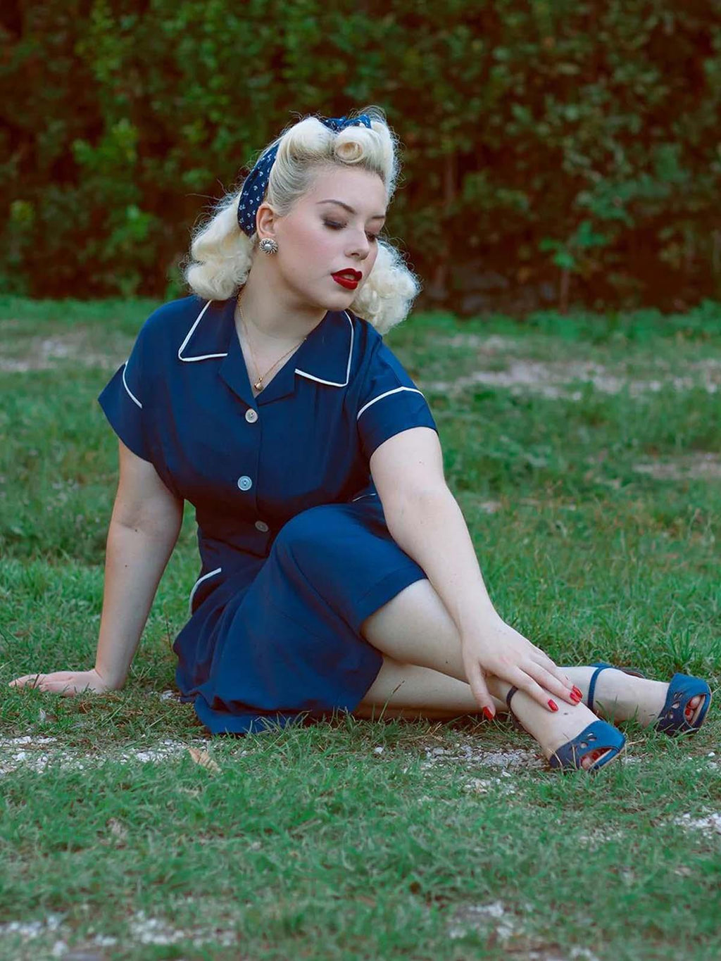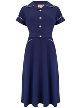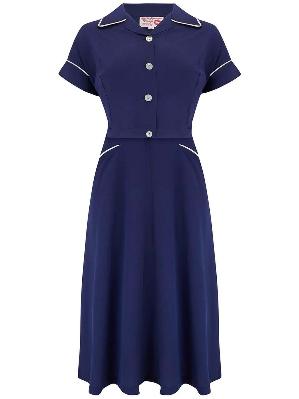 This simple and classic two-piece set is a brilliant vintage staple, comprosing of both a navy blue dress and a matching bolero that can be worn together or separately. This wonderful, easy to wear dress radiates authentic late 1940s to early 1950s style with its cute sweetheart neckline, matching fabric belt, and ivory contrast piping.