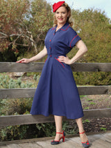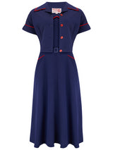 This simple and classic two-piece set is a brilliant vintage staple, comprosing of both a navy blue dress and a matching bolero that can be worn together or separately. This wonderful, easy to wear dress radiates authentic late 1940s to early 1950s style with its cute sweetheart neckline, matching fabric belt, and red contrast piping.