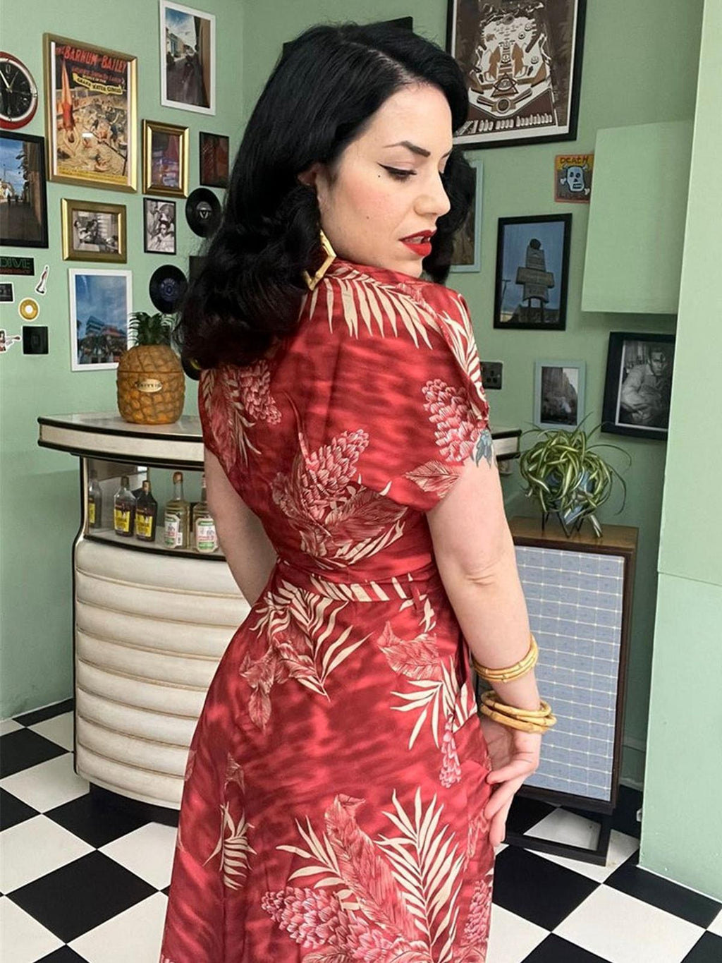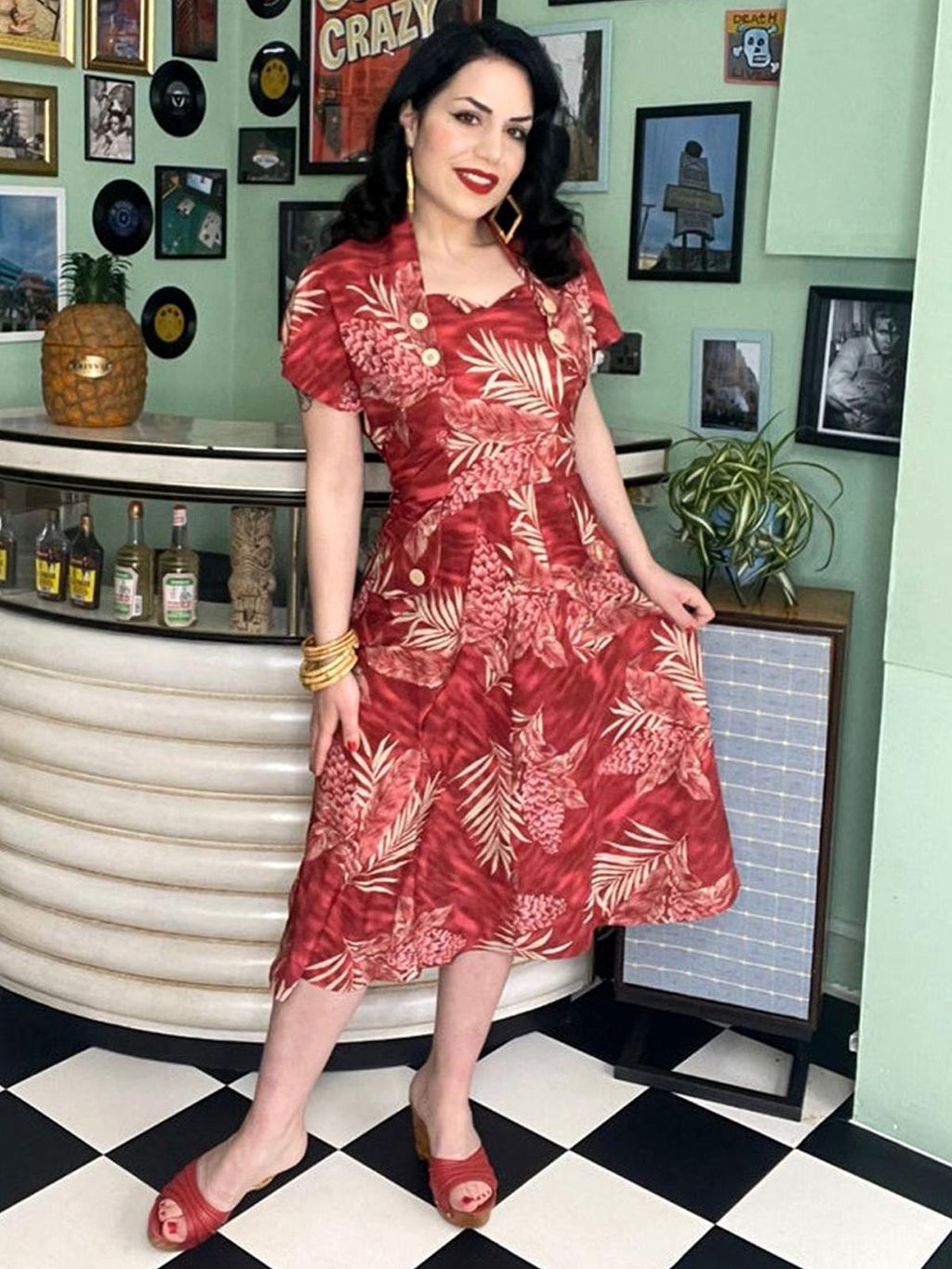 Just perfect for a fun-filled day at a vintage fair, or a night out swing jiving to your favourite Rock'n'Roll. The iconic fifties print features a red and beige palm tree print with a tropical feel. It is a direct copy of a true vintage fabric, realised in authentic poly crepe fabric which hangs beautifully and is soft to the touch.