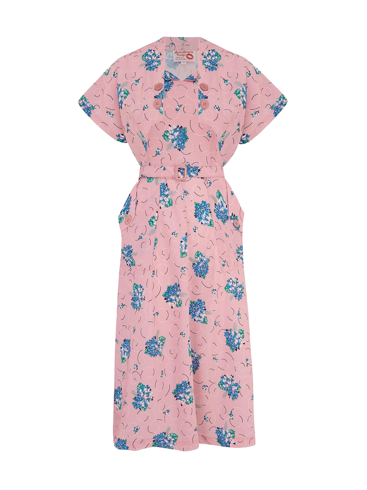 Made from soft poly crepe fabric in a blue polka dot and white floral print copied from a true vintage design, it’s perfect for vintage fairs, rockabilly nights, and retro daywear.