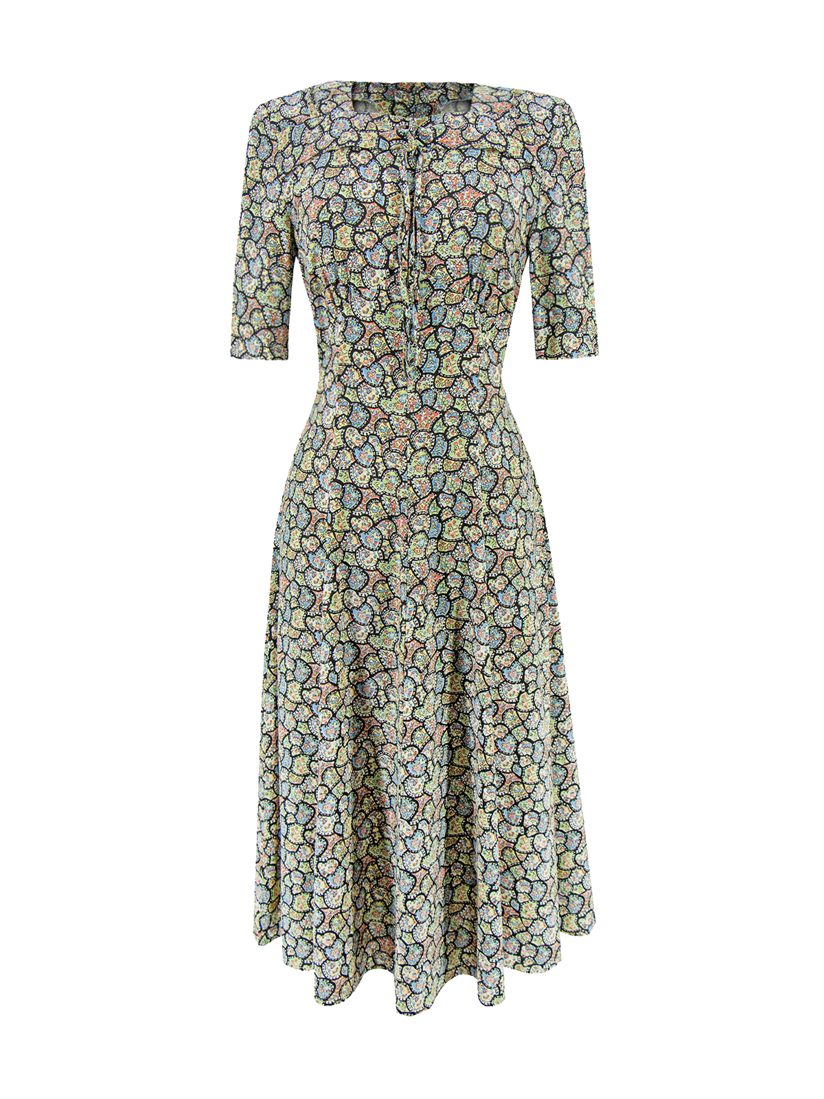 The pattern for our popular Floral Tribute dress was taken directly from an original rationed 11011 or "double elevens" dress, and is a flattering quintessentially 1940s shape. The patchwork print features a carefully replicated original 40s design from an old bale of fabric in our archive.