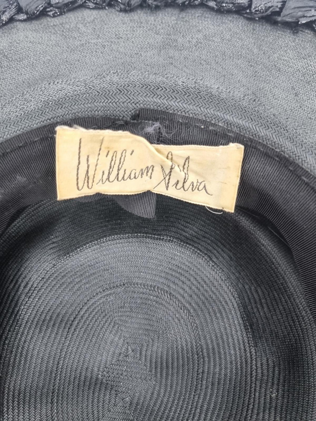 An original 1940s vintage black straw hat with a flat crown and wide brim. It is decorated with raffia around both the brim and crown, giving it texture and detail. A dramatic piece, perfect for adding flair to any vintage outfit.