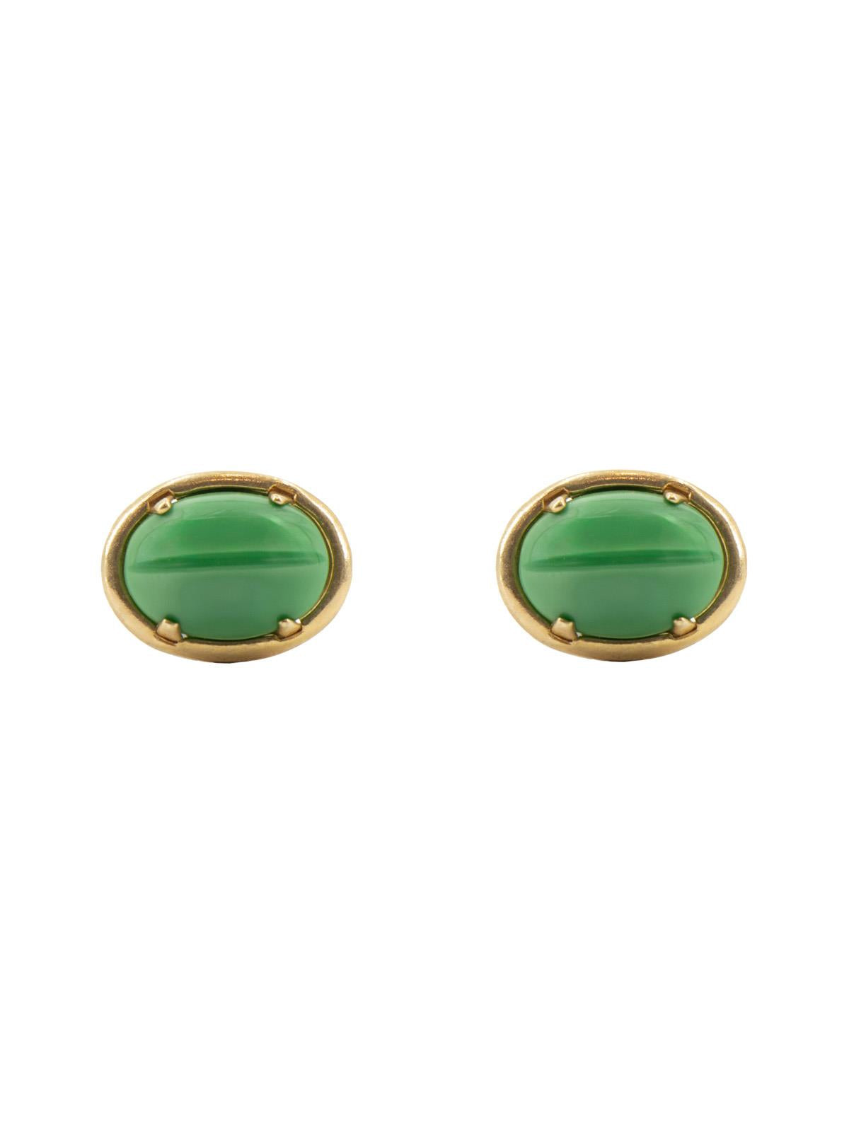 True vintage 1950s deadstock gold-plated and green glass cabochon cufflinks in a classic claw setting. The glass is a striking shade and has a subtle cats eye at the centre of each piece.