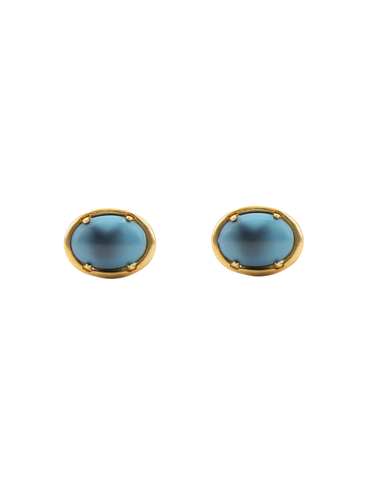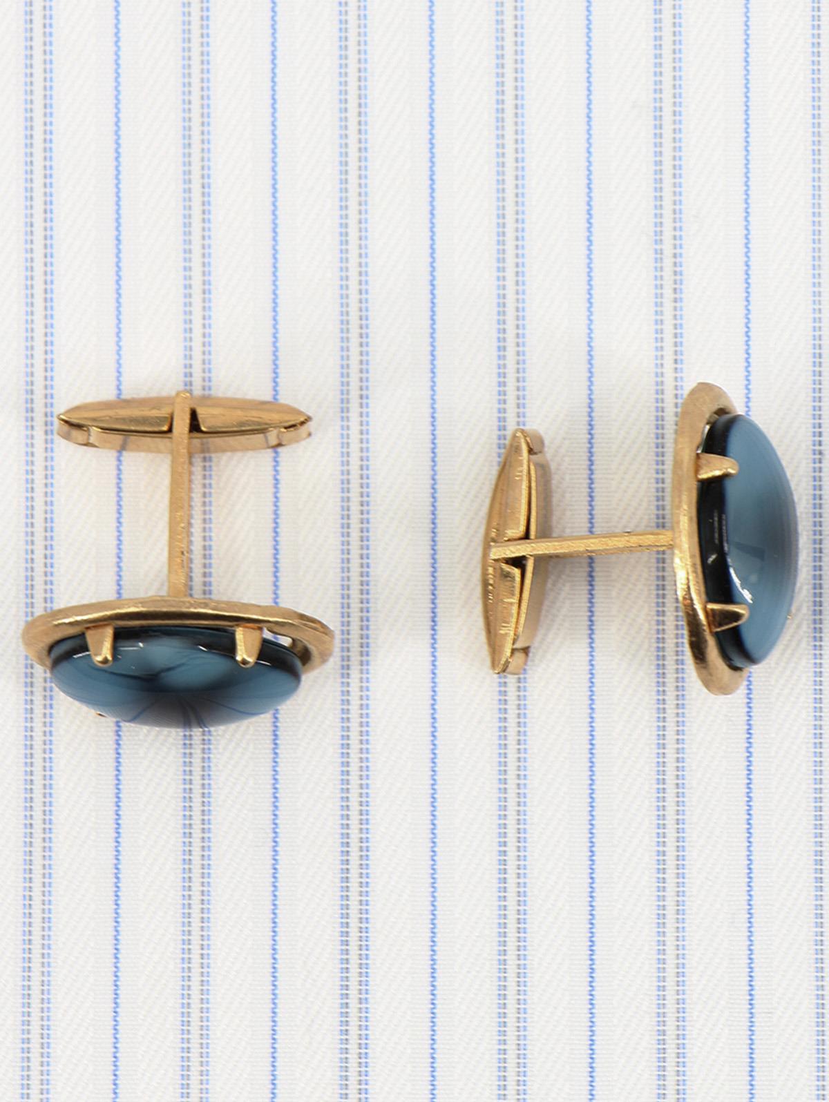 Authentic 1950s deadstock cufflinks in gold plate, set with sky blue glass cabochons in a classic four-claw oval mount. The glass has a striking shade with darker tones running through it, adding depth and visual interest. Complete with a suedette gift pouch.